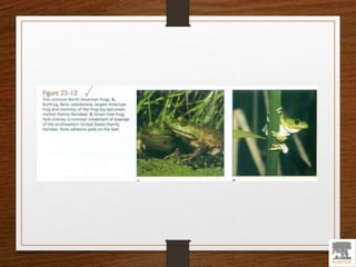 Amphibians evolved from ancient sarcopterygians and include three modern orders: Caudata (salamanders), Gymnophiona (caecilians), and Anura (frogs and toads). Amphibians have undergone anatomical modifications to support terrestrial locomotion while retaining aquatic adaptations. They exhibit complex life cycles including aquatic larval stages and terrestrial adult stages. Amphibians face challenges regulating water, temperature, and gas exchange on land and in water.