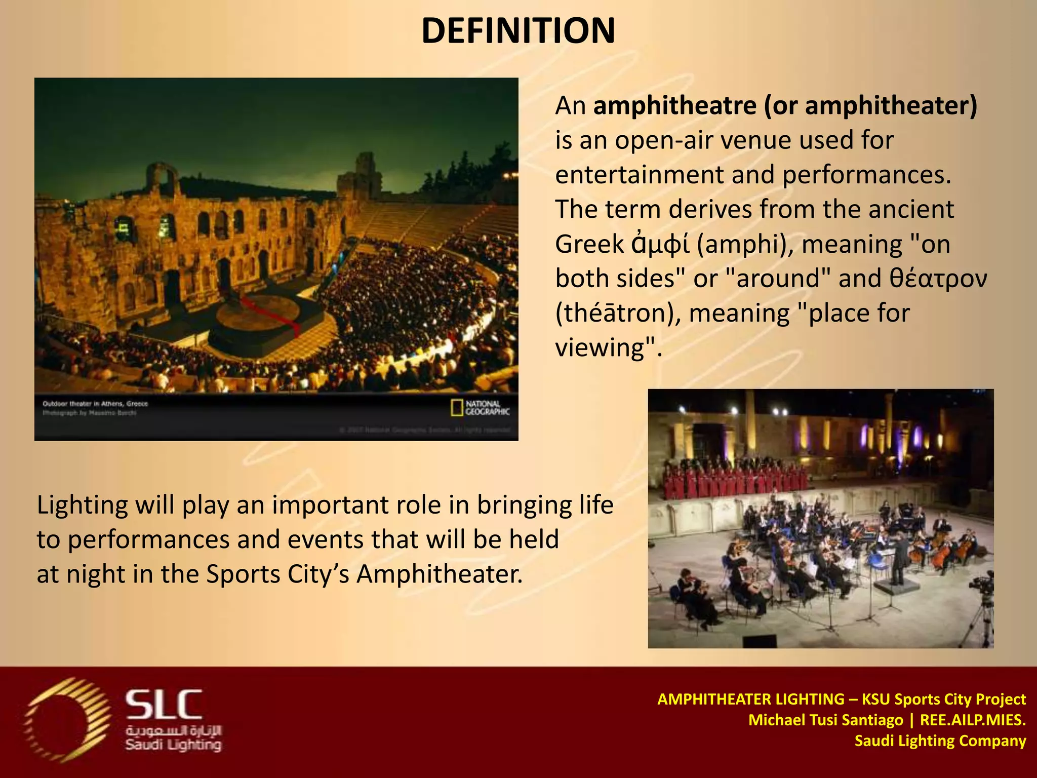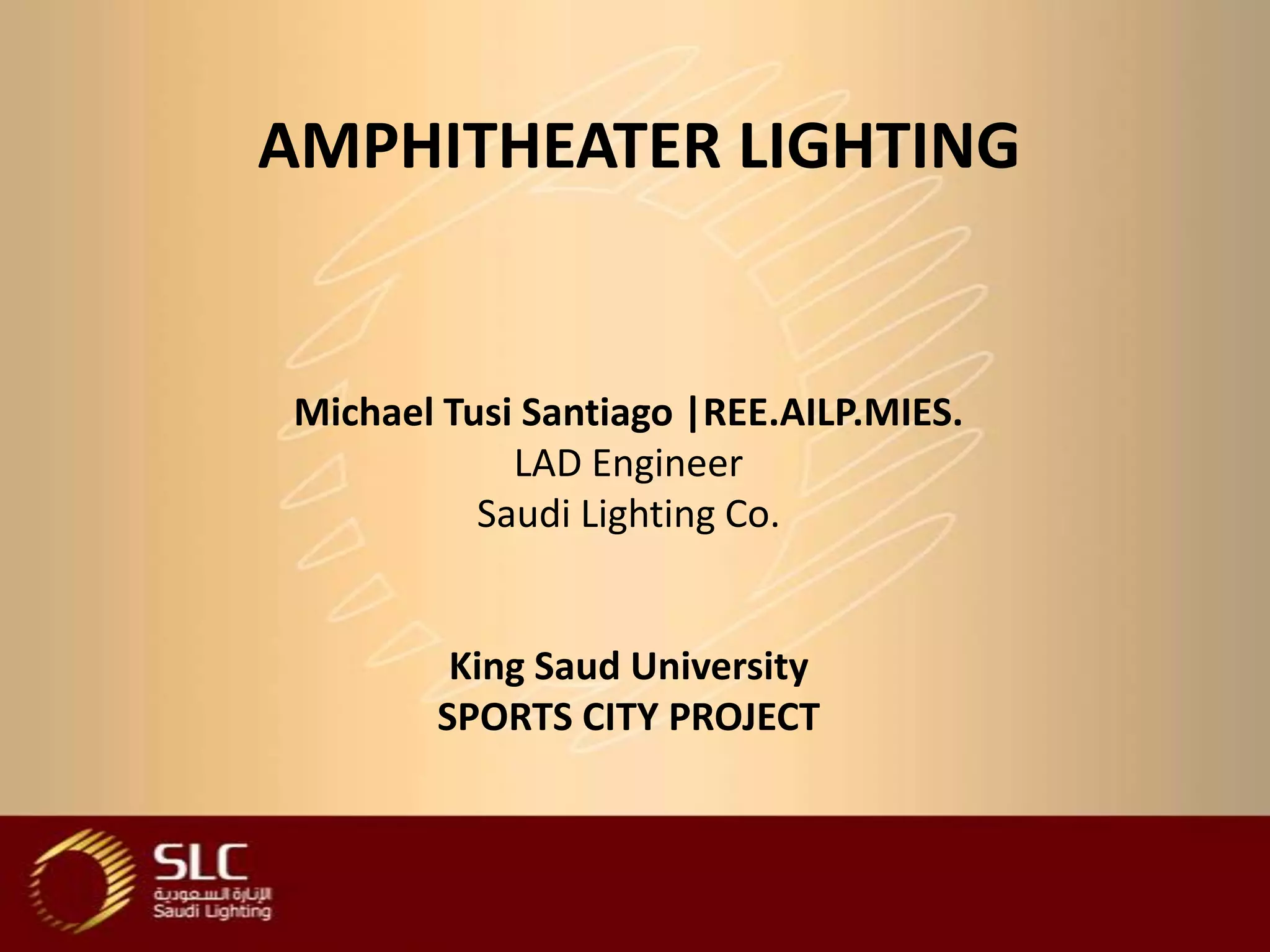 Michael Tusi Santiago of Saudi Lighting Company presented a lighting design for an amphitheater being built at King Saud University's Sports City project. The design included general ambient lighting for when no performance is occurring, as well as lighting schemes for regular shows, special televised events, and before/after show times. Renderings showed the lighting plans from various angles and with color filters. The luminaire options were also presented.