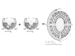 The document discusses the history and evolution of amphitheaters in ancient Rome, beginning with early temporary structures and culminating in the iconic Colosseum. It describes the development of amphitheater construction from simple excavated pits to sophisticated stone structures like the Colosseum with its elaborate subterranean network. The document also examines other notable amphitheaters throughout the Roman Empire.
