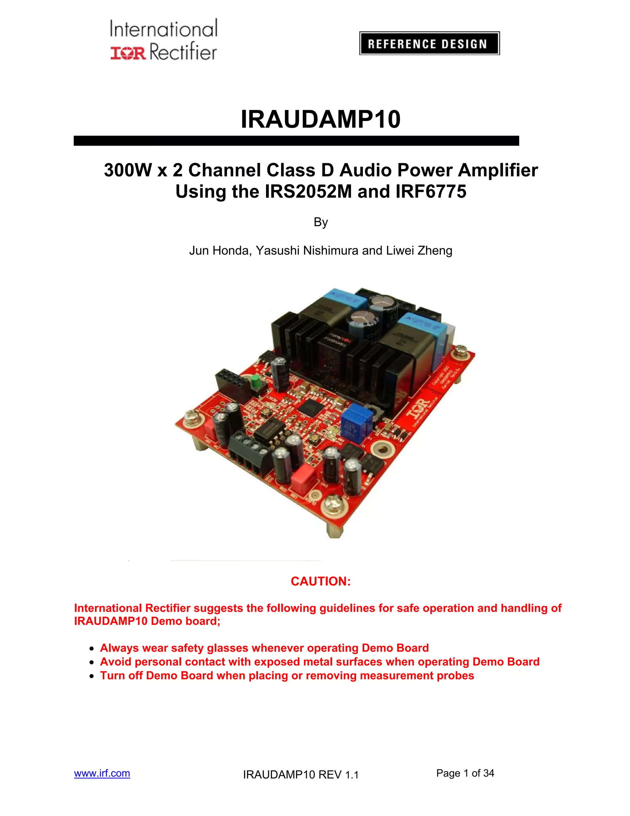 The document details the iraudamp10, a two-channel class D audio power amplifier utilizing the IRS2052M IC and IRF6775 MOSFETs, designed for a variety of audio applications including AV receivers and automotive amplifiers. It highlights features such as 300W output per channel, high efficiency, and protective measures like over-current and over-temperature protection. Additionally, it provides guidelines for setup, testing procedures, and performance metrics, as well as safety precautions for handling the demo board.
