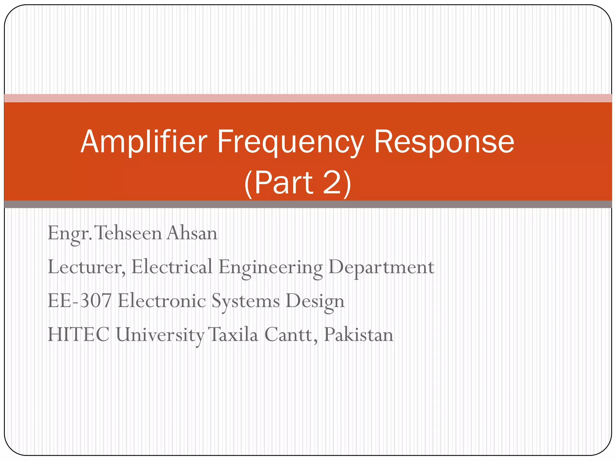 This document discusses the frequency response of amplifiers. It explains that an amplifier's frequency response can be analyzed using a Bode plot. An amplifier's bandwidth is defined as the range of frequencies between its lower and upper critical frequencies (fcl(dom) and fcu(dom)), where the voltage gain is 3dB below the midrange value. The unity-bandwidth product states that for an amplifier with a -20dB/decade roll-off, the product of its voltage gain and bandwidth remains constant. The unity-gain frequency, fT, is the frequency at which the amplifier's gain reaches 1, and it is always equal to the midrange voltage gain multiplied by the bandwidth. When analyzing multistage ampl