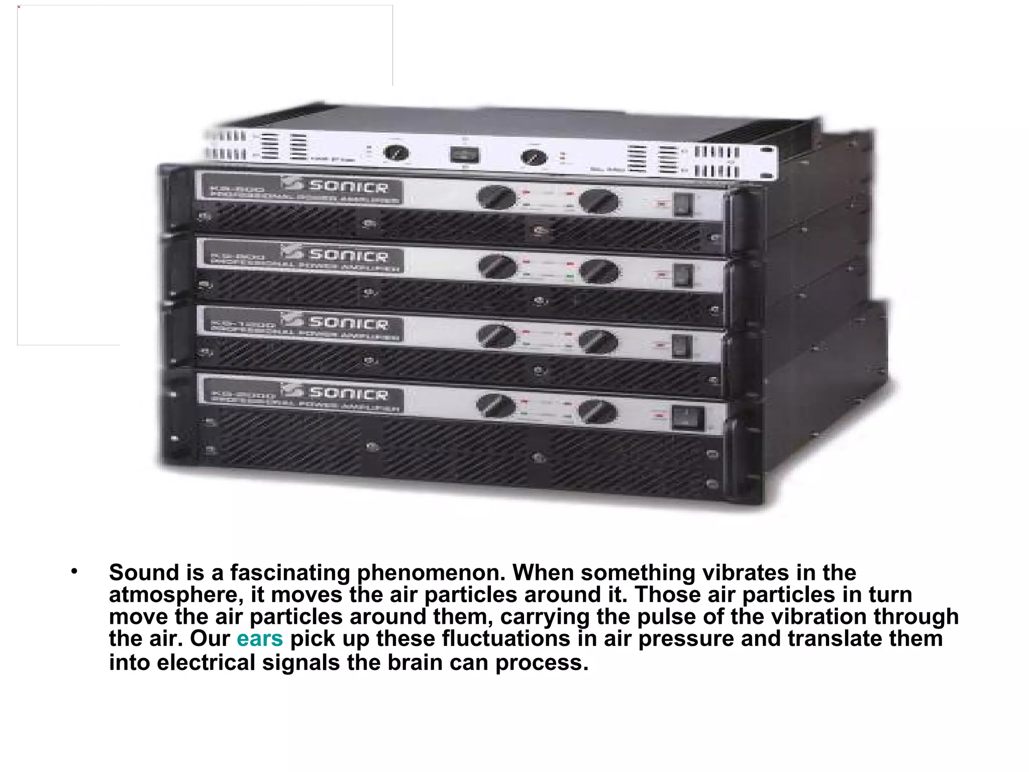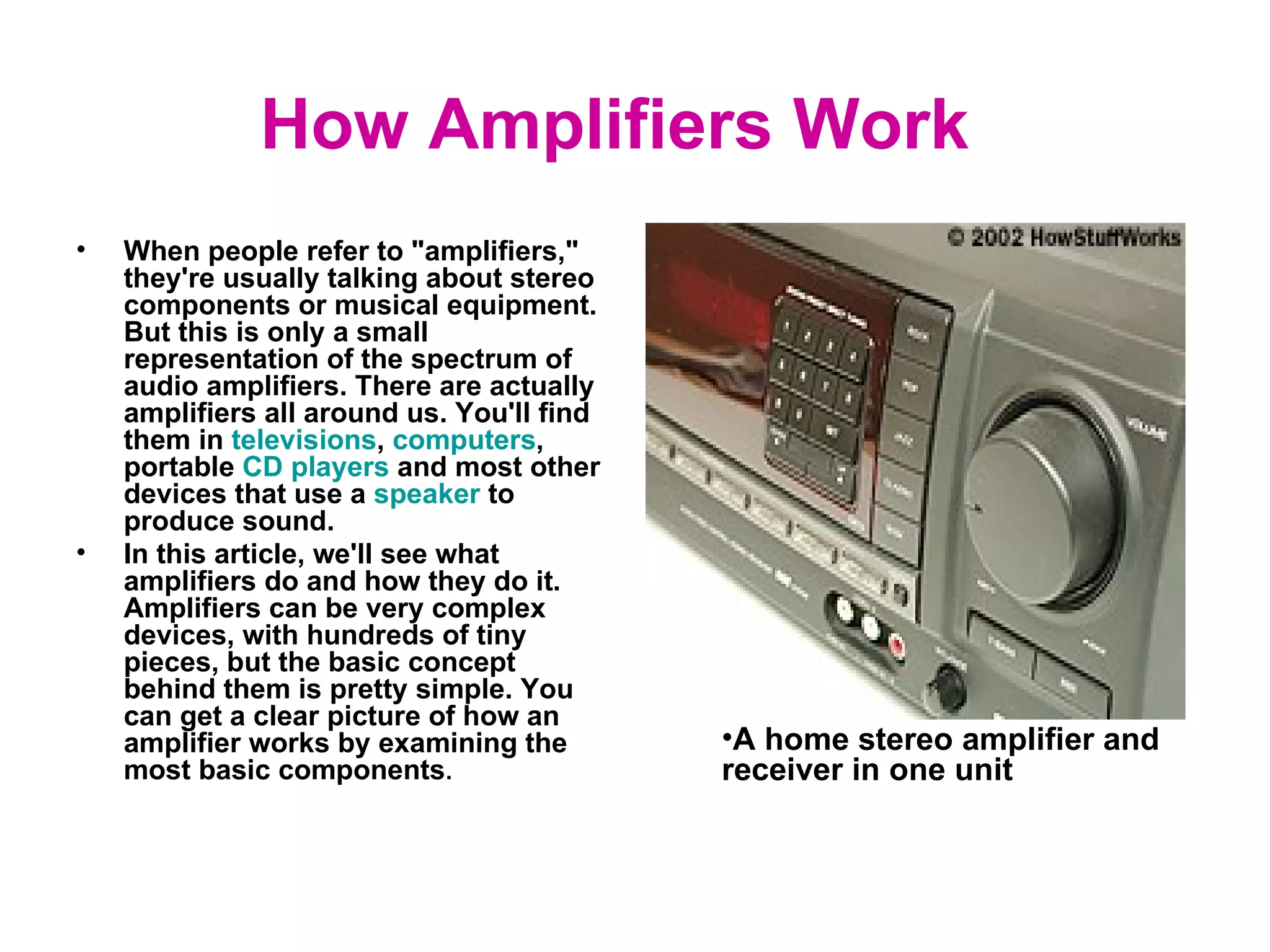 An amplifier takes a weak audio signal and boosts it to a stronger signal that can drive a speaker. It does this through a process of multiple boosting stages within the amplifier. At the heart of most amplifiers is a transistor, which uses variations in its electrical resistance controlled by a small input signal to modify a larger output current supplied by the amplifier's power source. This allows it to accurately reproduce the original audio signal but at a higher volume level suitable for the speaker.