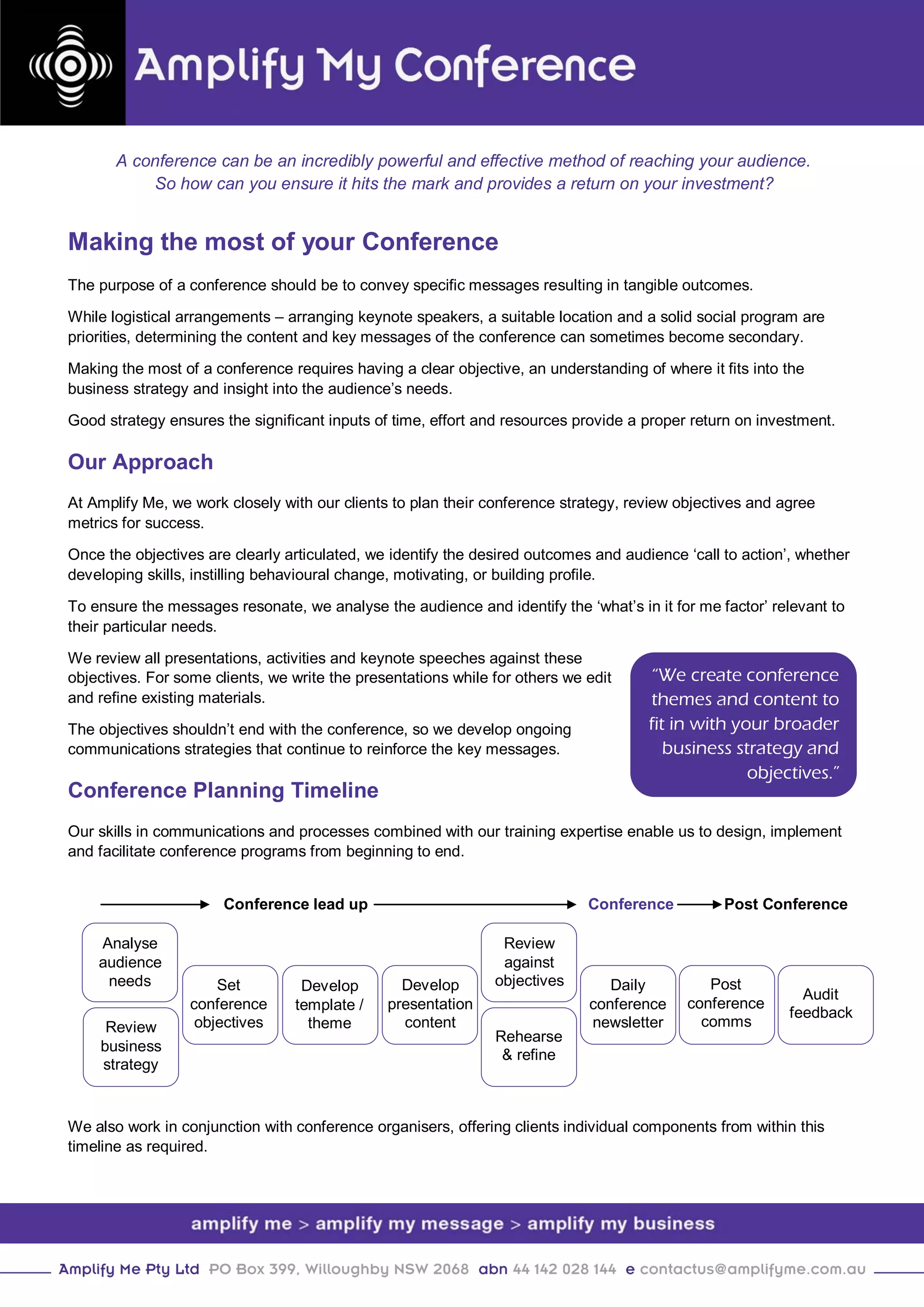 Conferences can effectively convey important messages and yield a return on investment when planned with clear objectives and audience insight. Amplify Me collaborates with clients to define their conference strategy, focusing on desired outcomes and tailoring content to audience needs. The planning process includes pre- and post-conference analysis, refining materials, and ensuring alignment with broader communication strategies.