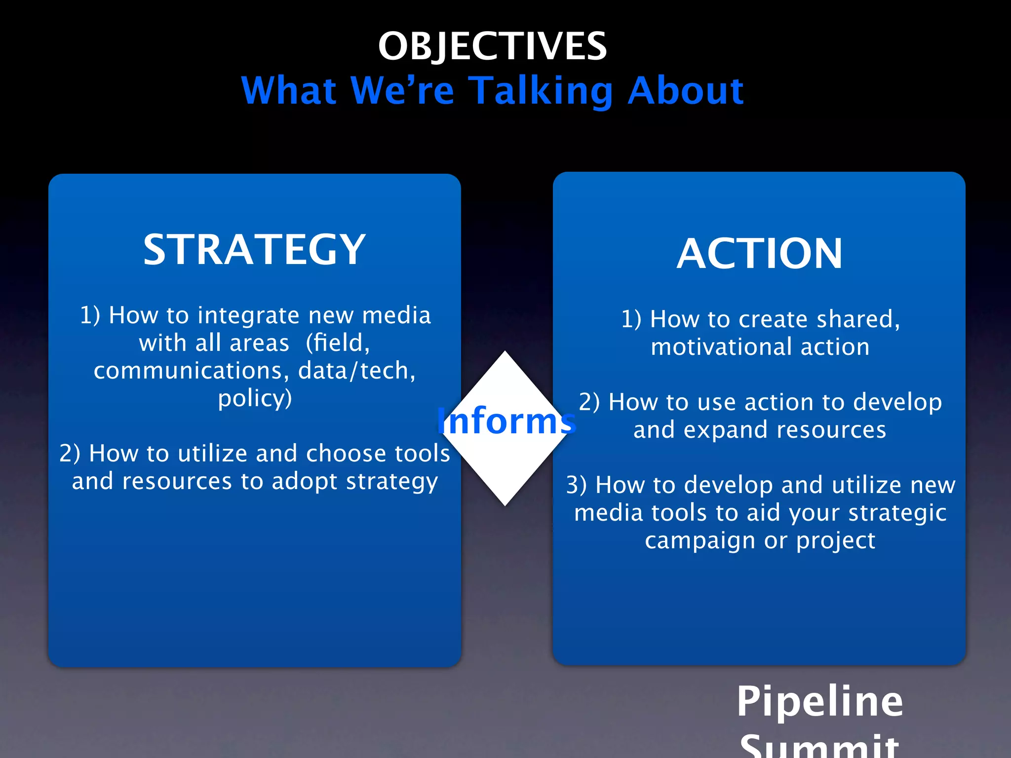 The document provides an overview of a summit on integrating new media into campaigns and organizations. It discusses [1] developing a new media strategy, [2] choosing appropriate tools and platforms, and [3] utilizing new media to support and expand traditional work. Examples of platforms mentioned include Facebook, Twitter, blogs and sharing images on sites like Flickr. The summit also includes exercises to help attendees develop a new media strategy for a specific event or issue.