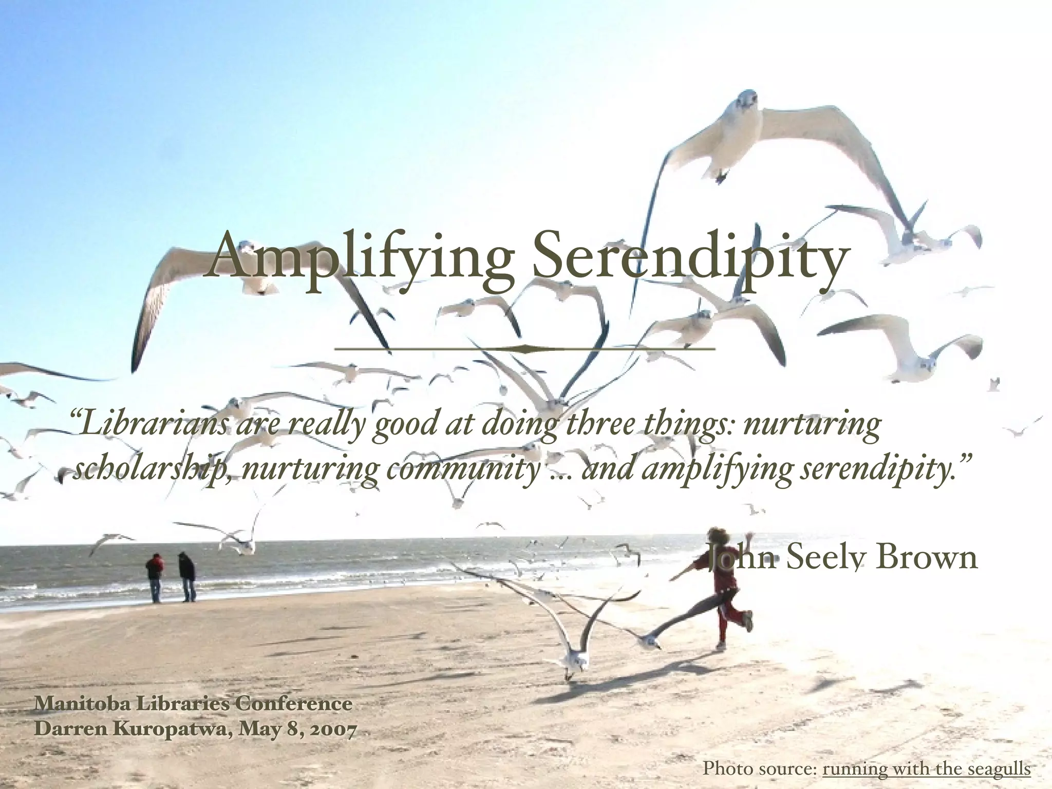 The document discusses the evolving role of librarians in fostering scholarship, community, and serendipity, as noted by John Seely Brown. It reflects on the impact of Web 2.0 on user engagement and library services, emphasizing interactive and personalized experiences. Additionally, it includes personal anecdotes and updates from authors like Robert Jordan and J.K. Rowling, demonstrating a connection between communities and literature.