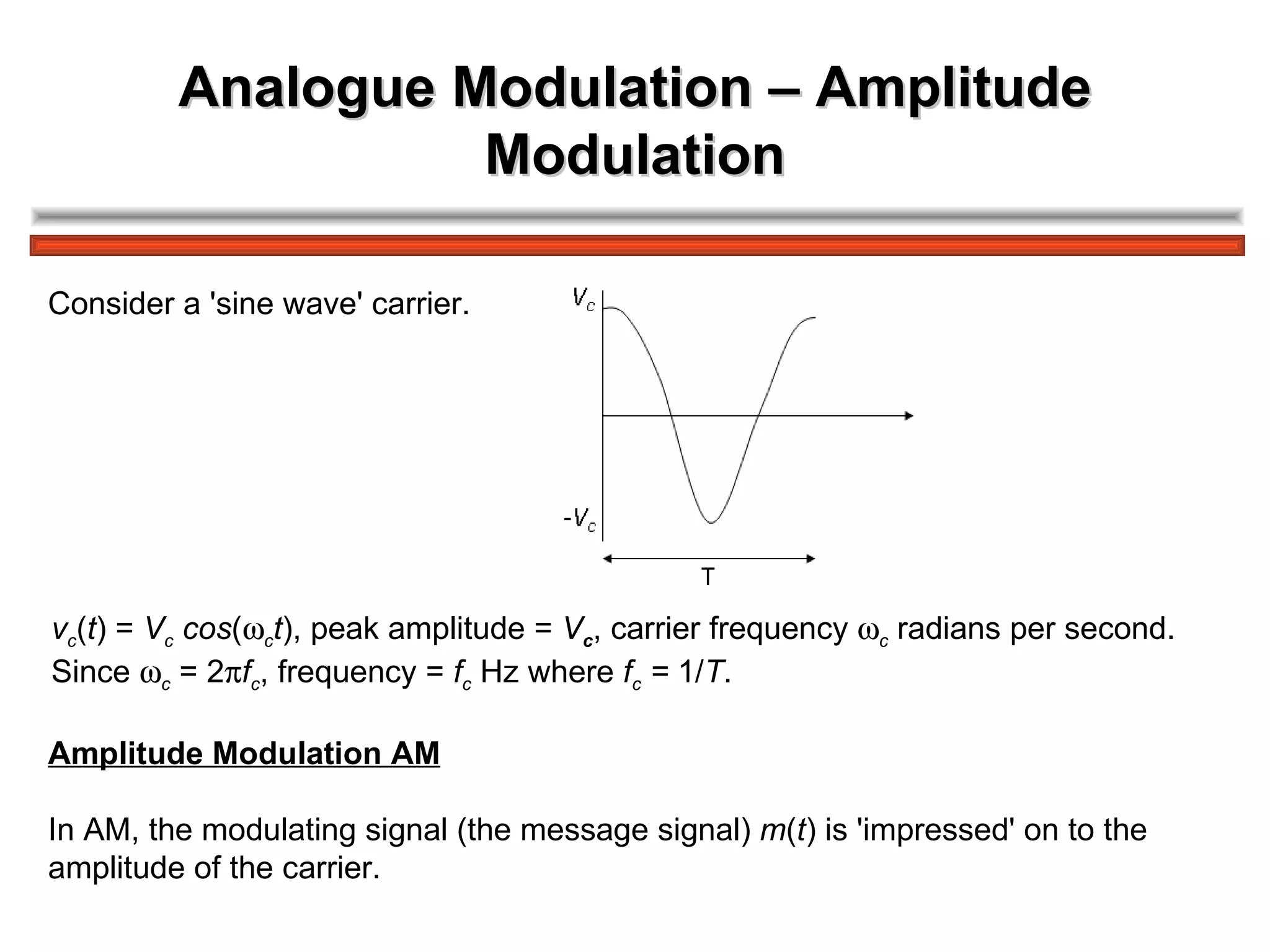 The document discusses amplitude modulation (AM) and different types of AM including double sideband AM (DSBAM), single sideband AM (SSBAM), and their modulation, demodulation, bandwidth requirements, and power considerations. It provides equations, diagrams, and explanations for DSBAM, SSBAM, and synchronous demodulation. Key aspects covered include the carrier signal, message signal, sidebands, modulation depth, spectrum analysis, and transmitter power efficiency comparisons between DSBAM and SSBAM.