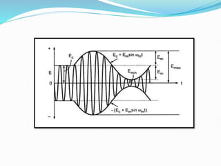 1) Amplitude modulation involves varying the amplitude of a carrier signal based on the amplitude of a message signal.