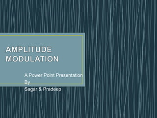 This PowerPoint presentation discusses amplitude modulation (AM). It defines AM as a process where the amplitude of a carrier signal is altered according to information in a message signal. Common applications of AM include broadcasting and aircraft communications. The presentation explains key aspects of AM signals such as the carrier signal, modulating signal, envelope, and modulation index. It also covers bandwidth, power measurements, and advantages of AM such as reducing antenna height and increasing communication range.