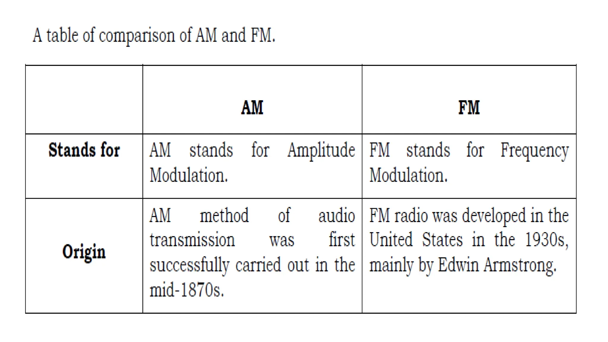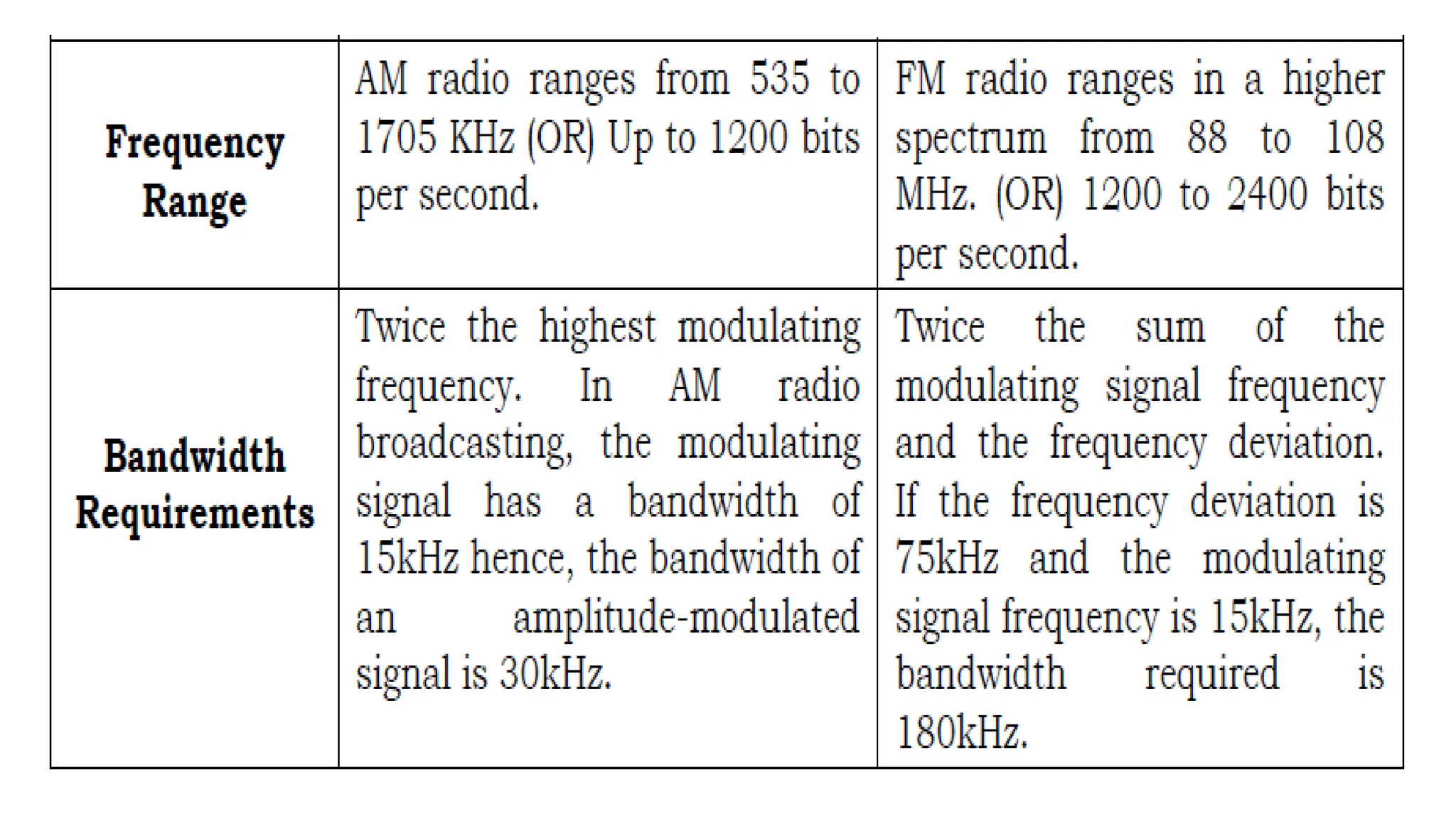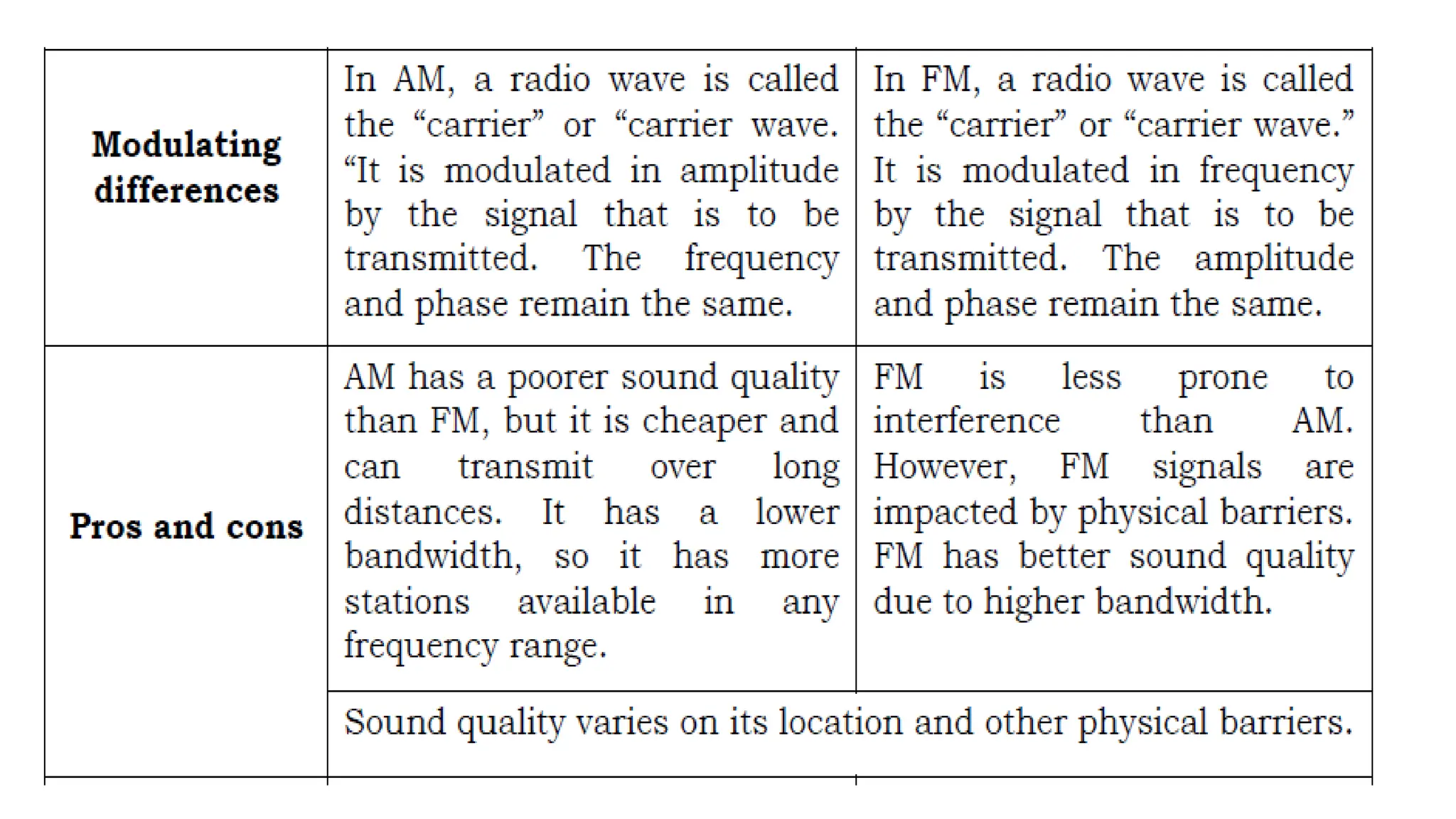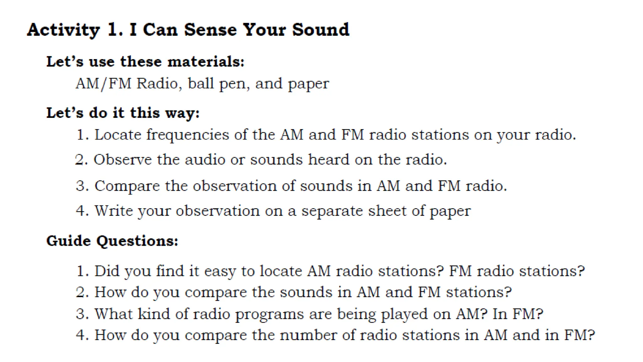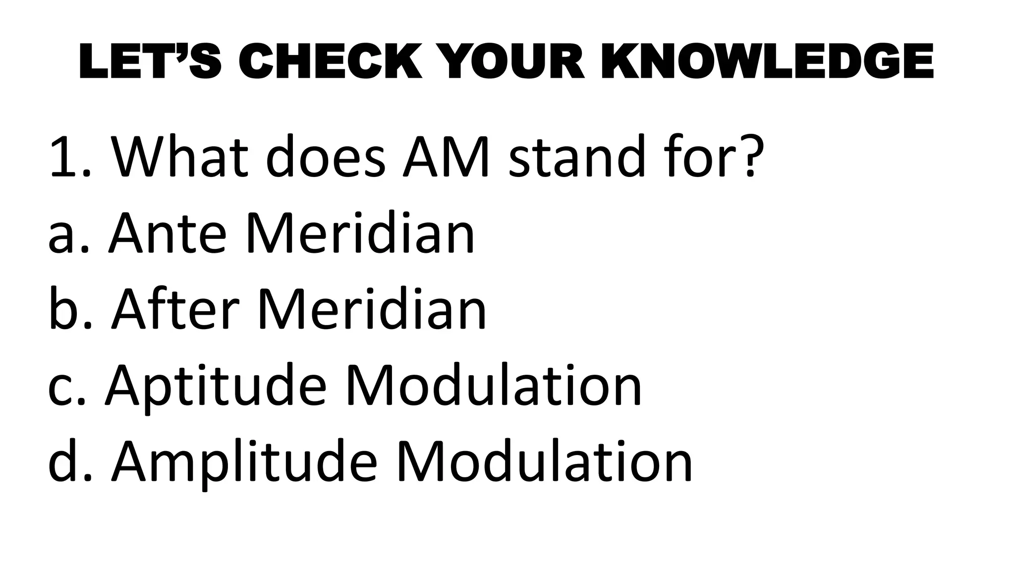 This document discusses amplitude modulation (AM) and frequency modulation (FM) radio. It begins with a quiz about AM and FM radio frequencies and characteristics. AM radio operates between 535 kHz to 1605 kHz while FM radio operates between 88 MHz to 108 MHz. FM radio has better sound quality than AM radio because it has a higher bandwidth (150 kHz vs 10 kHz for AM), allowing it to transmit more audio information. The document then discusses how to tune a radio to different stations by changing the radio frequency setting to match the frequency a station broadcasts on. It explains that radio signals are received at specific frequencies to avoid receiving all stations simultaneously.