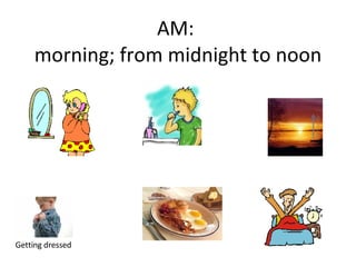 This document discusses the difference between AM and PM times. AM refers to morning, from midnight to noon, while PM refers to afternoon and evening, from noon to midnight. Examples are provided of getting dressed either in the morning or evening to indicate whether it is AM or PM time.