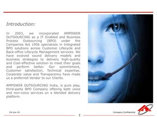 AMPOWER OUTSOURCING is an IT and BPO company established in 2003 that specializes in integrated BPO solutions and customer/back-office lifecycle management services. It aims to deliver high-quality, cost-effective solutions through sound delivery models and business strategies. AMPOWER OUTSOURCING has over 500 seats in New Delhi and offers services like customer support, data processing, and accounts processing. It focuses on recruiting qualified employees and providing thorough training to ensure quality service delivery.