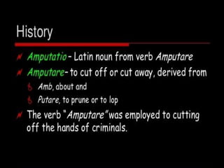 Preoperative management focuses on relieving anxiety, reducing pain, increasing mobility, and maintaining good nutrition and health through evaluation of body systems. Postoperative management monitors for complications like hemorrhage and infection, promotes acceptance of changes, controls pain, and supports physical recovery and independent living. Amputation is performed at the lowest possible level that will heal, based on circulation and functional usefulness. Common nursing diagnoses for patients include acute pain, risk of phantom limb sensations, skin issues from surgery, changes to body image and coping, and deficits in self-care and mobility due to limb loss.