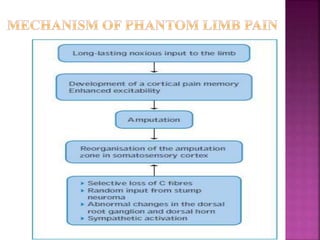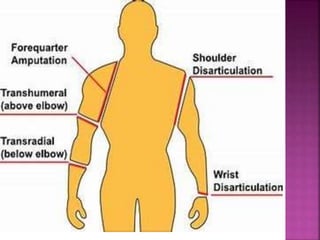 The document provides information about amputation, including definitions, types, causes, indications, and management. It discusses the epidemiology of amputation globally and regionally. It describes the diagnostic evaluation and various types of amputations, including closed and open amputations. Post-operative care involves pain management, wound care, exercise and rehabilitation to improve mobility and self-care abilities. Nursing focuses on managing pain, promoting mobility and self-esteem, and preventing complications like infection.