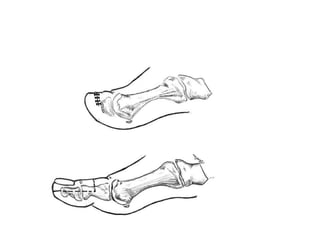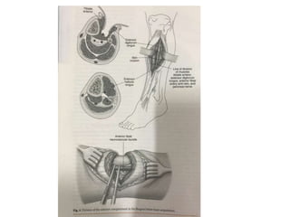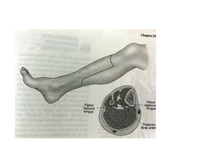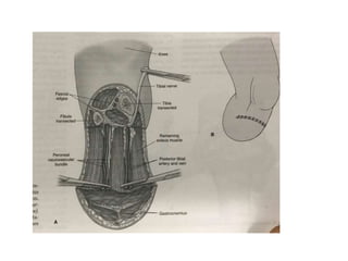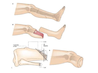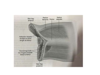 This document discusses different types and procedures for lower limb amputations. It describes minor amputations like transphalangeal toe amputation and transmetatarsal amputation, which aim to preserve foot function. Major amputations include below knee (BKA), above knee, and through knee disarticulation. The Burgess technique is described for BKA, involving a myocutaneous flap from gastrocnemius and soleus muscles. Above knee amputation involves a transverse incision and ligation of the superficial femoral artery and sciatic nerve division. Postoperative management focuses on wound healing and prosthetic fitting.