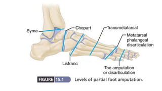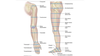 Amputation involves surgically removing a limb or part of a limb. It is often necessary for conditions like peripheral vascular disease, trauma, infection, or tumors. The level and type of amputation depends on factors like the condition necessitating it, the patient's health and goals. The goal is to perform the amputation at the most distal level possible to maximize function while still addressing the medical issue. Care is taken to ensure good blood supply, length, and mobility of the residual limb after amputation. Post-operative rehabilitation including exercises and prosthesis fitting helps patients adapt.