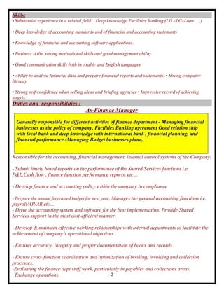 The document is a CV for Amro Hassan Baioumy Mahmmoud, who is seeking a position as a finance manager. Some key details include: