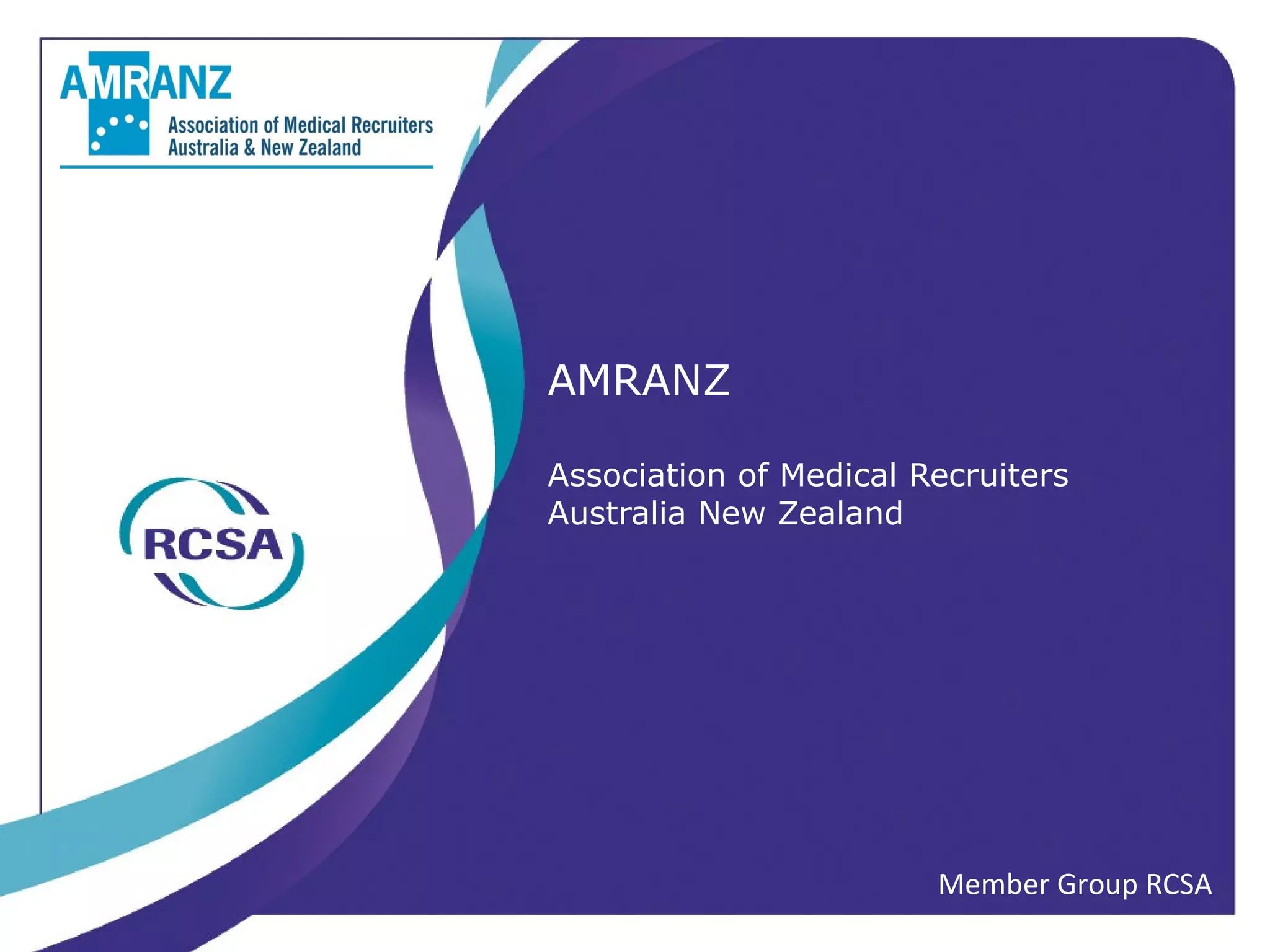 The document summarizes information about AMRANZ (Association of Medical Recruiters Australia New Zealand) and RCSA (Recruitment & Consulting Services Australia). AMRANZ was established in 2005 as a member group of RCSA to represent medical recruitment consultancies in Australia and New Zealand. RCSA is the industry body representing the recruitment profession in Australia and New Zealand with over 3,800 members. The document provides information on leadership, benefits of membership, and professional accreditation framework for individuals and corporate members.