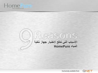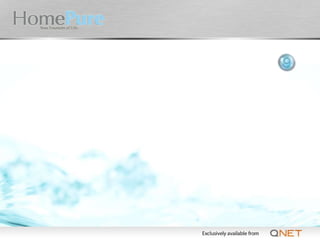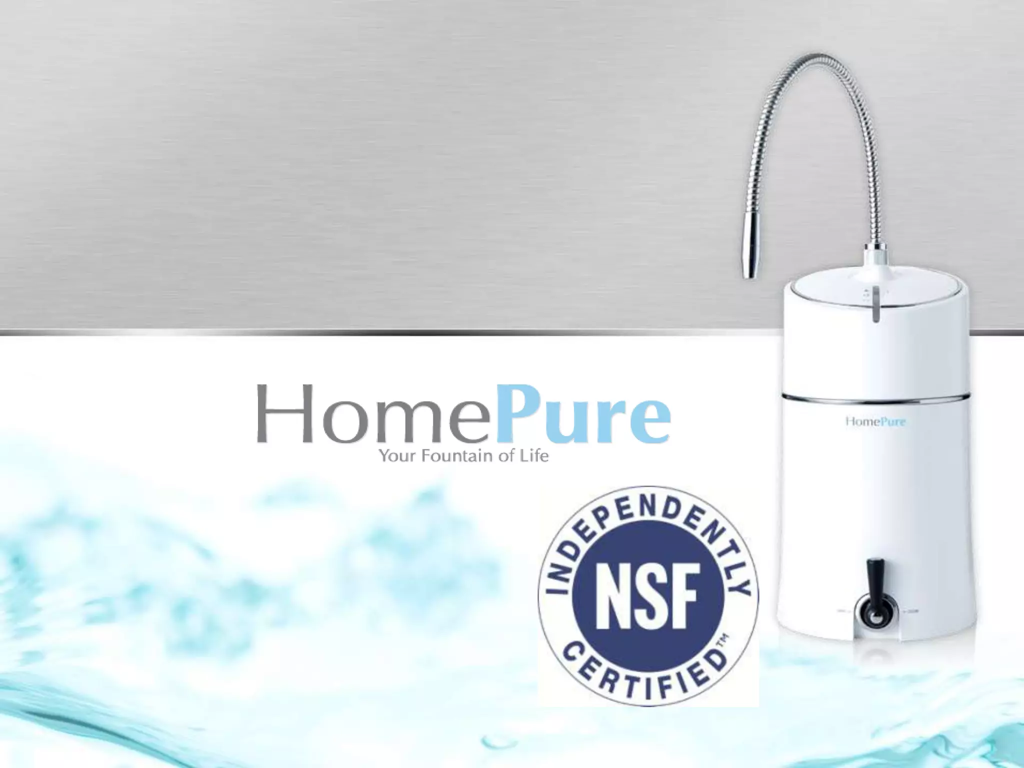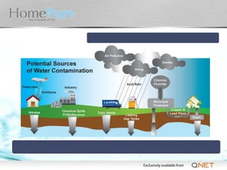 This document discusses the HomePure Pi-Water system and its features. It notes that the system uses ultrafiltration to remove 99.9% of contaminants like lead, mercury, asbestos and Cryptosporidium. It claims the system reduces levels of disinfection by-products and is certified by NSF International to meet NSF/ANSI standards for health and sustainability.