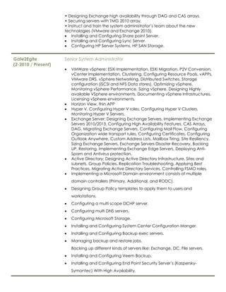 Amr Hussein provides his contact information and experience working as a system administrator for the Egyptian Sales Tax Authority and Gate2Egite. He has 8 years of experience working with servers including Microsoft Windows, Exchange, SharePoint, Lync, VMware, Hyper-V, Active Directory, and backup solutions. His skills include server administration, virtualization, networking, storage, security, and cloud technologies.