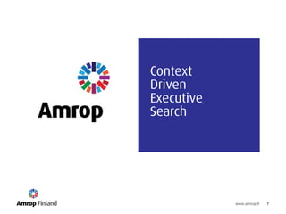 Amrop is a global executive search firm that helps clients identify leaders for roles around the world. They offer executive search, board consulting, and management assessment services. Their approach is client-centered, research-based, technology-enabled, and leverages their large global network to provide integrated, local expertise with a global perspective.
