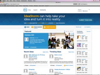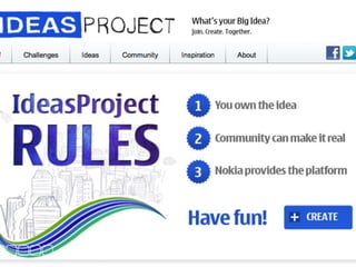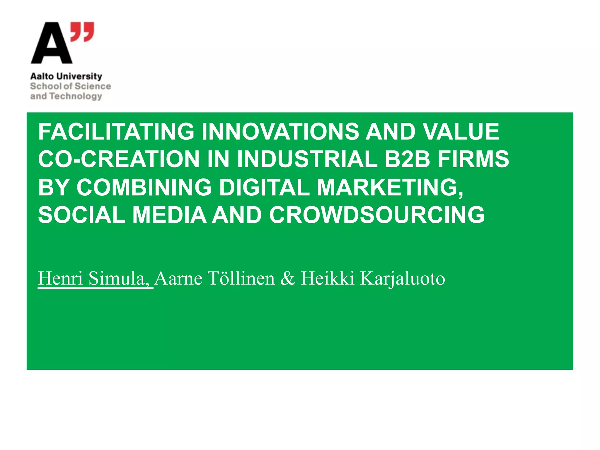 This document discusses how industrial B2B firms can combine digital marketing, social media, and crowdsourcing to facilitate innovation and value co-creation. It proposes a model where firms use social media to improve awareness of idea challenges and use crowdsourcing to solicit new ideas and solutions from customers and end users. While some large B2B firms have begun using social media for marketing, the document finds they have not fully utilized it for innovation or crowdsourcing from external groups due to concerns about purchasing processes, intellectual property, product complexity, and lack of resources. However, as social media use increases over time, especially among younger workers, the document suggests crowdsourcing potential for B2B firms will grow.