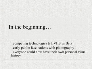 1) In the mid-19th century, competing photographic technologies like the daguerreotype and calotype emerged, making personal photography accessible to the public for the first time.