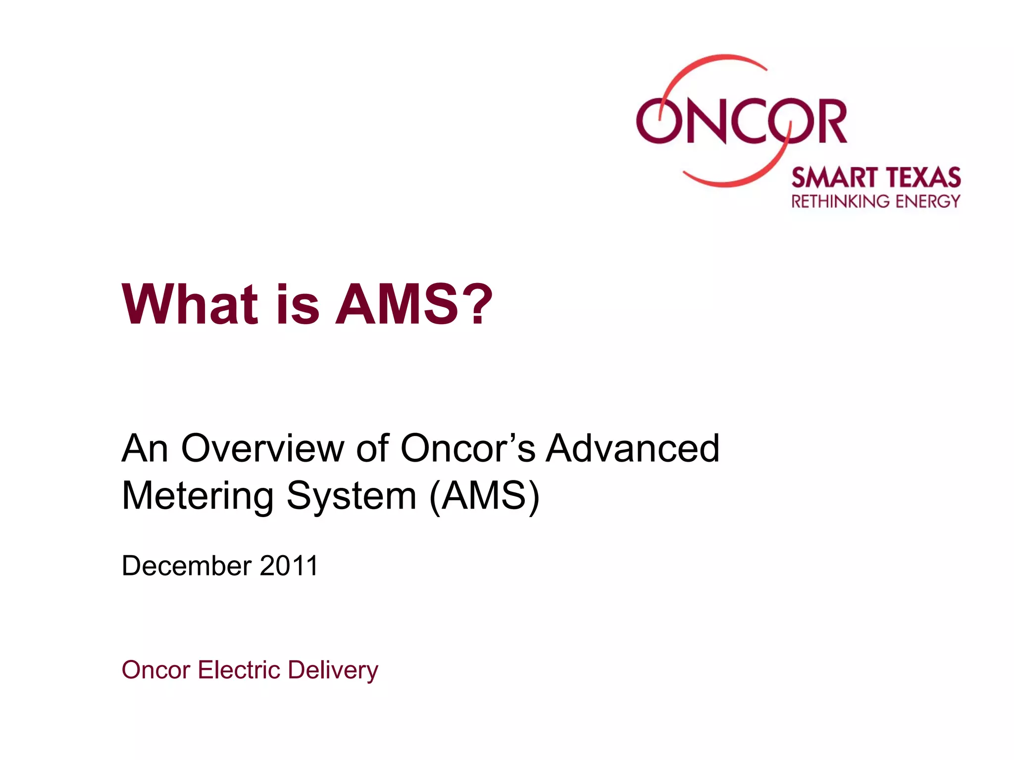 Oncor's Advanced Metering System (AMS) involves installing up to 3.2 million smart meters across its service territory by 2012. The smart meters will automatically collect customer energy usage data at 15-minute intervals and transmit it through a wireless mesh network and backhaul system. This data is validated and used to provide timely energy consumption information to customers, retailers, and ERCOT to support energy conservation, pricing programs, outage detection, and other benefits.