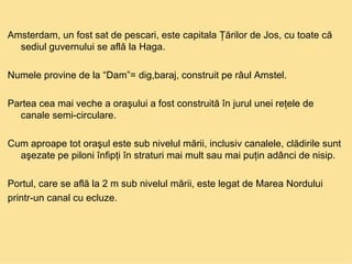 Amsterdam, capitala Țărilor de Jos, are un istoric bogat ca fost sat de pescari, fiind construit pe o rețea de canale și având clădiri ridicate pe piloni. Palatul regal, simbol al puterii orașului, se află pe Piața Dam, înconjurat de centre comerciale precum Magna Plaza și atracții culturale precum Rijksmuseum. Orașul este cunoscut pentru străzile sale înguste și viața de noapte vibrantă, inclusiv 'cartierul roșu', dar vizitarea se face mai bine prin croaziere pe canale.
