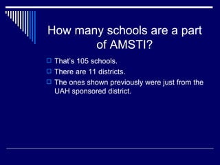 The Alabama Math, Science, and Technology Initiative (AMSTI) is a statewide program that aims to improve math and science education for K-12 students. It provides professional development and hands-on materials and equipment to over 100 participating schools across 11 districts. The goal is to prepare students with skills for post-secondary education and careers. AMSTI began in 2002 with funding from NASA and the US Department of Education and has since expanded with state funding and recognition for improving STEM education.