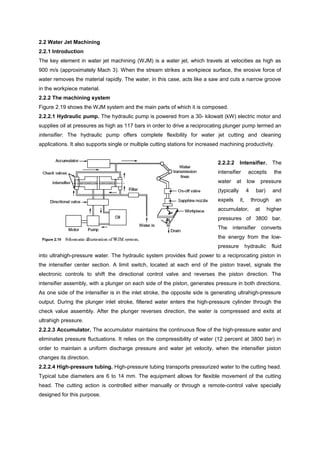 Water jet machining uses a high-pressure water jet to cut materials. The system includes a hydraulic pump, intensifier, accumulator, and cutting head. The intensifier converts low-pressure water to an ultrahigh-pressure water jet of around 3800 bar that is directed through a nozzle. This jet can precisely cut a variety of materials without heat and is used for cutting, drilling, deburring, surface treatment, and more. It has advantages over other methods like no heat affected zone and flexibility but higher hourly costs than mass production methods.