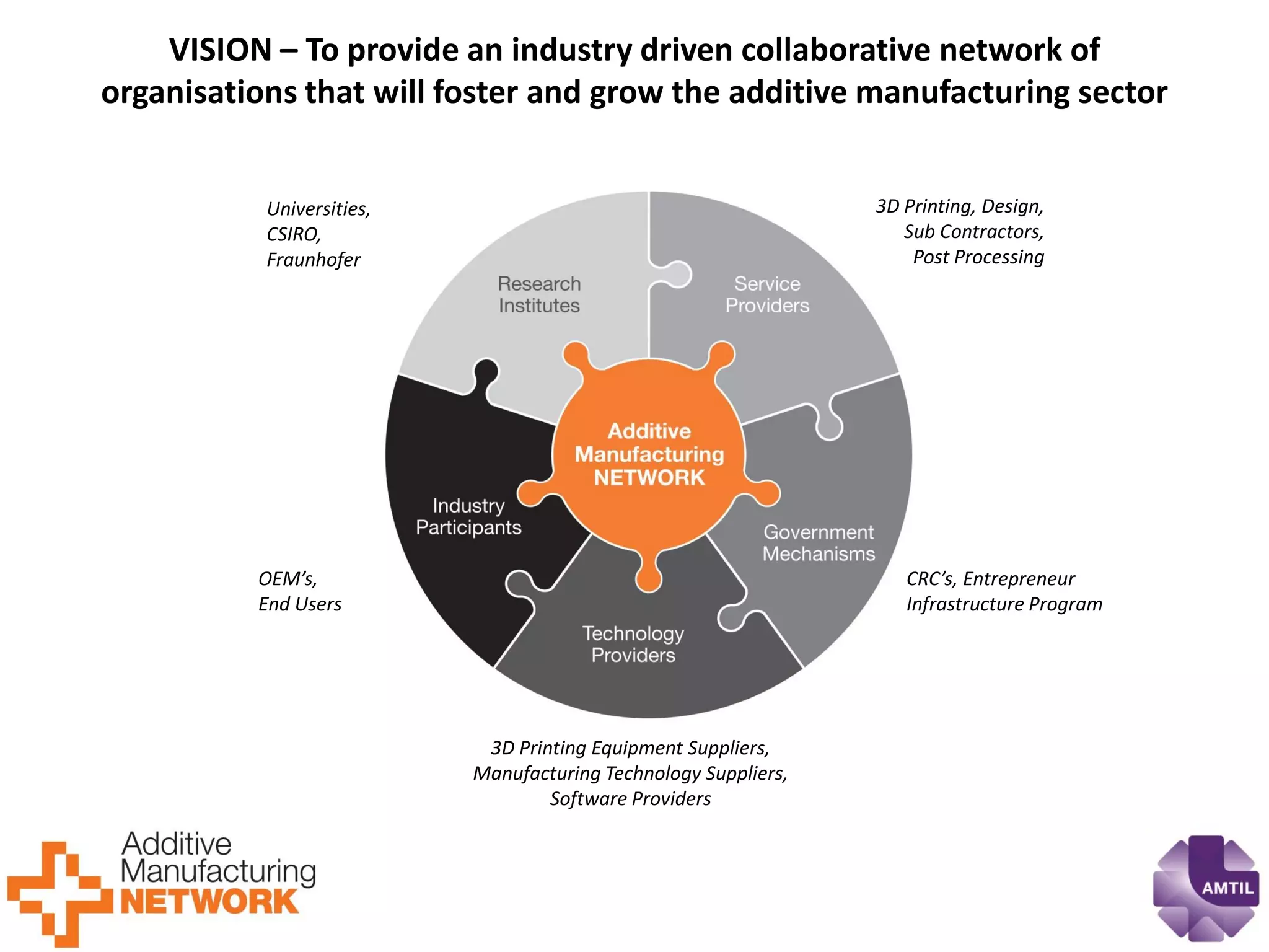 The document outlines a vision to create an industry-driven collaborative network to foster growth in the additive manufacturing sector in Australia. The network would bring together organizations across the additive manufacturing supply chain including 3D printing companies, universities, research organizations, manufacturers, and end users. It would be led by a committee and focus on providing value to end users. Membership in the network would offer benefits like access to industry information, events, and services through the Australian Manufacturing Technology Institute. The network aims to achieve goals around communication, knowledge sharing, research, networking, investment, marketing, and partnerships to accelerate the uptake and sustainability of additive manufacturing technologies.