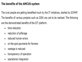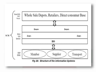 Amul began in 1946 with two village cooperatives collecting 250 liters of milk per day. It was founded to stop exploitation of milk producers by middlemen. Today, Amul collects over a million liters of milk daily from over 1000 village cooperatives owned by 500,000 farmers. Amul inspired India's white revolution and made the country the world's largest milk producer. It uses a three-tiered cooperative model with village, district, and state levels to efficiently procure, process and market milk and dairy products while empowering milk producers.