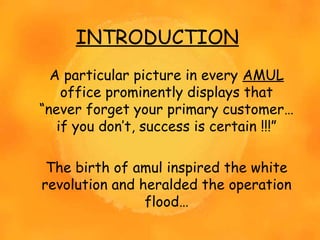 Amul was founded in 1946 with a vision to empower milk producers in Gujarat, India. It pioneered the cooperative model, ensuring fair prices for farmers. Amul focuses on high quality dairy products at affordable prices. It has a diverse product range and robust distribution network. Amul faces competition from large companies but has opportunities to expand to new markets and product categories through its strong brand and cooperative structure.