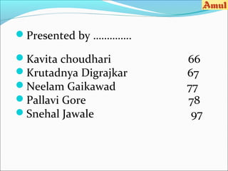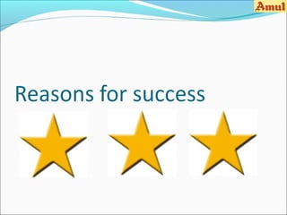 Amul is India's largest dairy cooperative and milk producer. It collects milk from 2.6 million farmers every day and converts it into branded, packaged products. Amul has a diverse product portfolio including milk, butter, ghee, cheese, chocolate, and ice cream. It has a robust supply chain and distribution network of over 500,000 retail outlets across India. Amul pursues a low-cost strategy to make its products affordable and uses promotional campaigns like the iconic Amul girl advertisements to increase brand awareness. It faces competition from other dairy companies but maintains its market leadership through quality products and a strong farmer network.