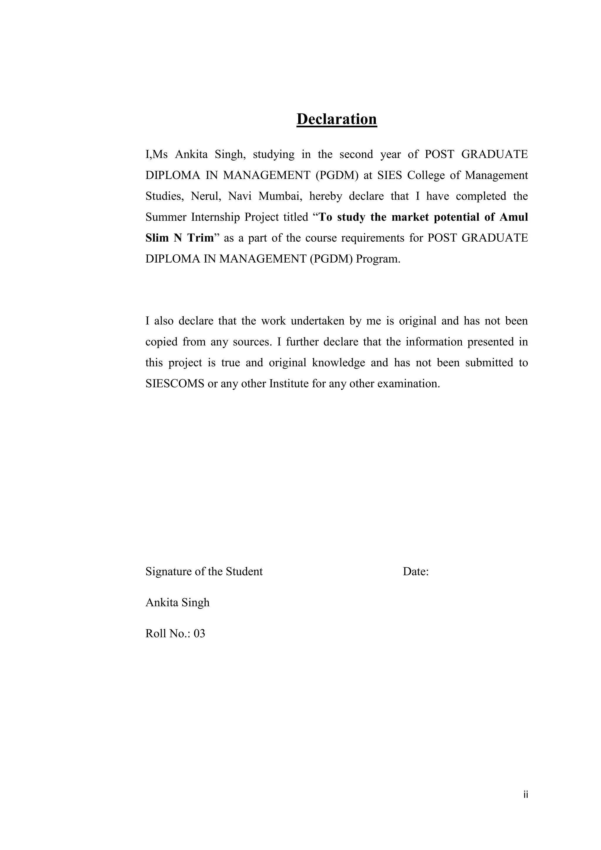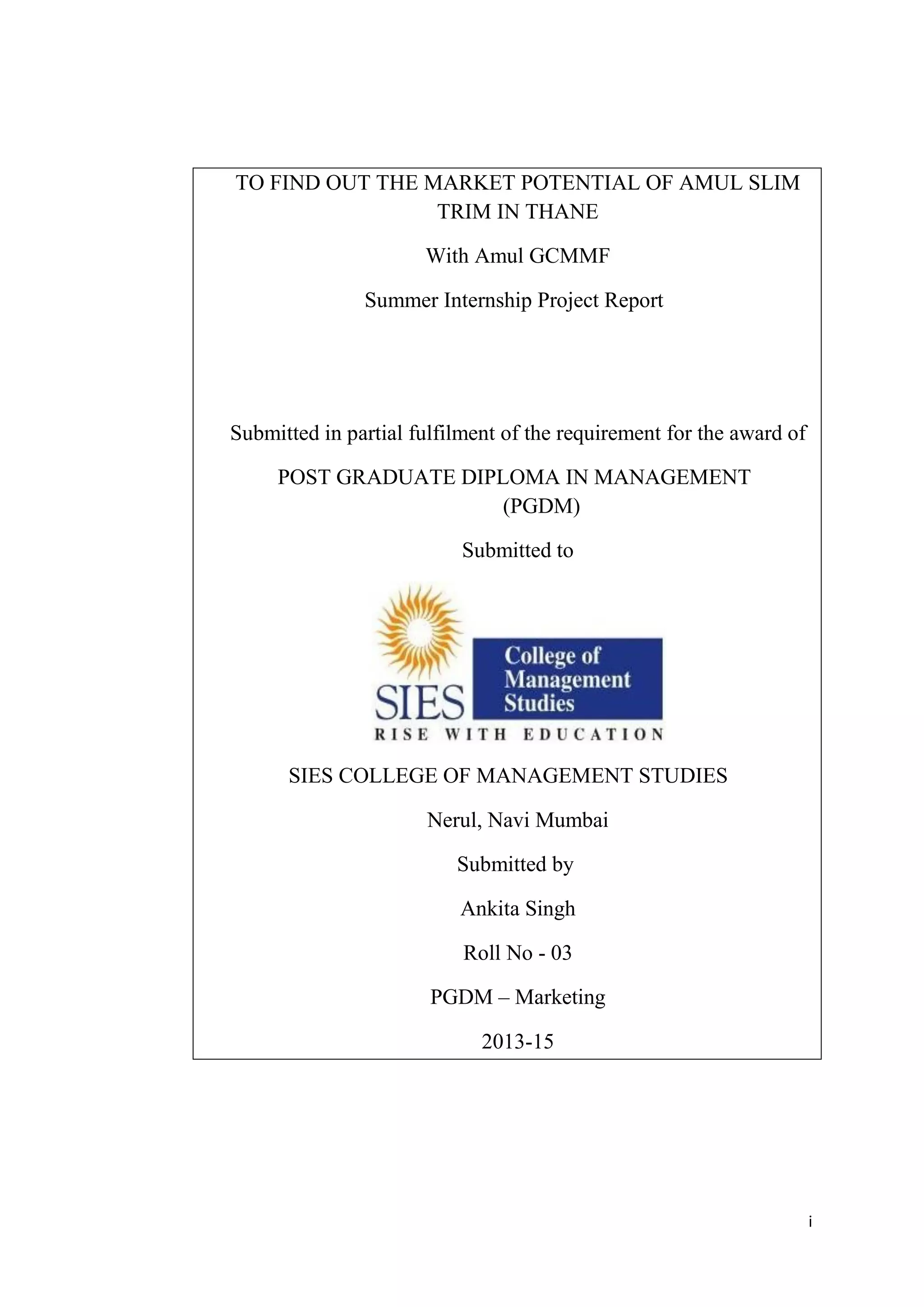 This document is a summer internship project report submitted by Ankita Singh to SIES College of Management Studies. The report studies the market potential of Amul Slim Trim in Thane. Amul is India's largest food product marketing organization owned by the Gujarat Cooperative Milk Marketing Federation. The objectives of the research were to bridge gaps between distributors and retailers, increase awareness of new product launches, and tap into untapped markets. The research involved collecting data from distributors and visiting 25 retail outlets in different areas of Thane over 3 months. The data analyzed availability, awareness, visibility and placement of products. Strategic models like SWOT analysis, product life cycle, segmentation, targeting and positioning were used