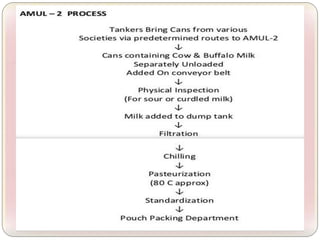The document presents a comprehensive overview of the Amul dairy operations, detailing its history, organizational structure, and various production sections including milk pouch, flavored milk, ghee, and electrical systems. Established in 1946, Amul has grown to become a significant player in the dairy industry, with extensive facilities and a focus on quality and efficiency. Key information includes the operational capacity, branding, and specifics of various plants and processes involved in milk and product production.