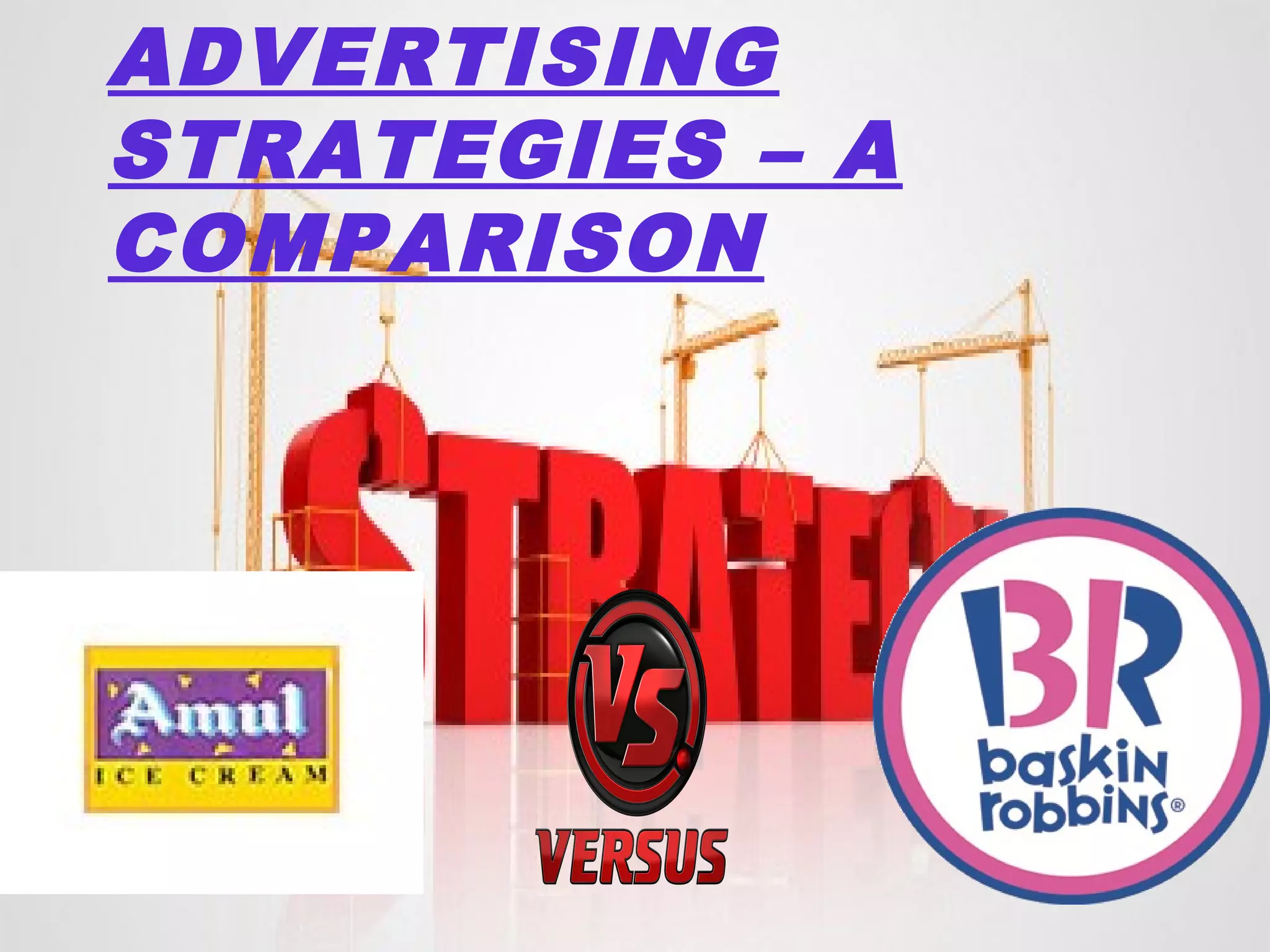 The document compares the advertising strategies of Amul and Baskin Robbins, highlighting Amul's journey since 1996 to capture market share through quality and affordability, and its unique advertising character, the Amul girl. Conversely, Baskin Robbins targets a more affluent market with innovative promotions linked to popular culture and focuses on high-quality, luxury ice creams. While Amul emphasizes low pricing and broad market appeal, Baskin Robbins aims to engage younger consumers through creative campaigns without prioritizing price reduction.