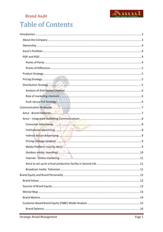 The document is a comprehensive brand audit of Amul, a leading dairy cooperative in India established in 1946. It covers various aspects of the brand including its ownership, product portfolio, marketing strategies, distribution network, and advertising approaches, highlighting its status as the world's largest pouched milk brand with a significant market presence. The audit analyzes Amul's unique branding elements, communication strategies, and financial performance, emphasizing its commitment to quality and affordability in serving a diverse consumer base.