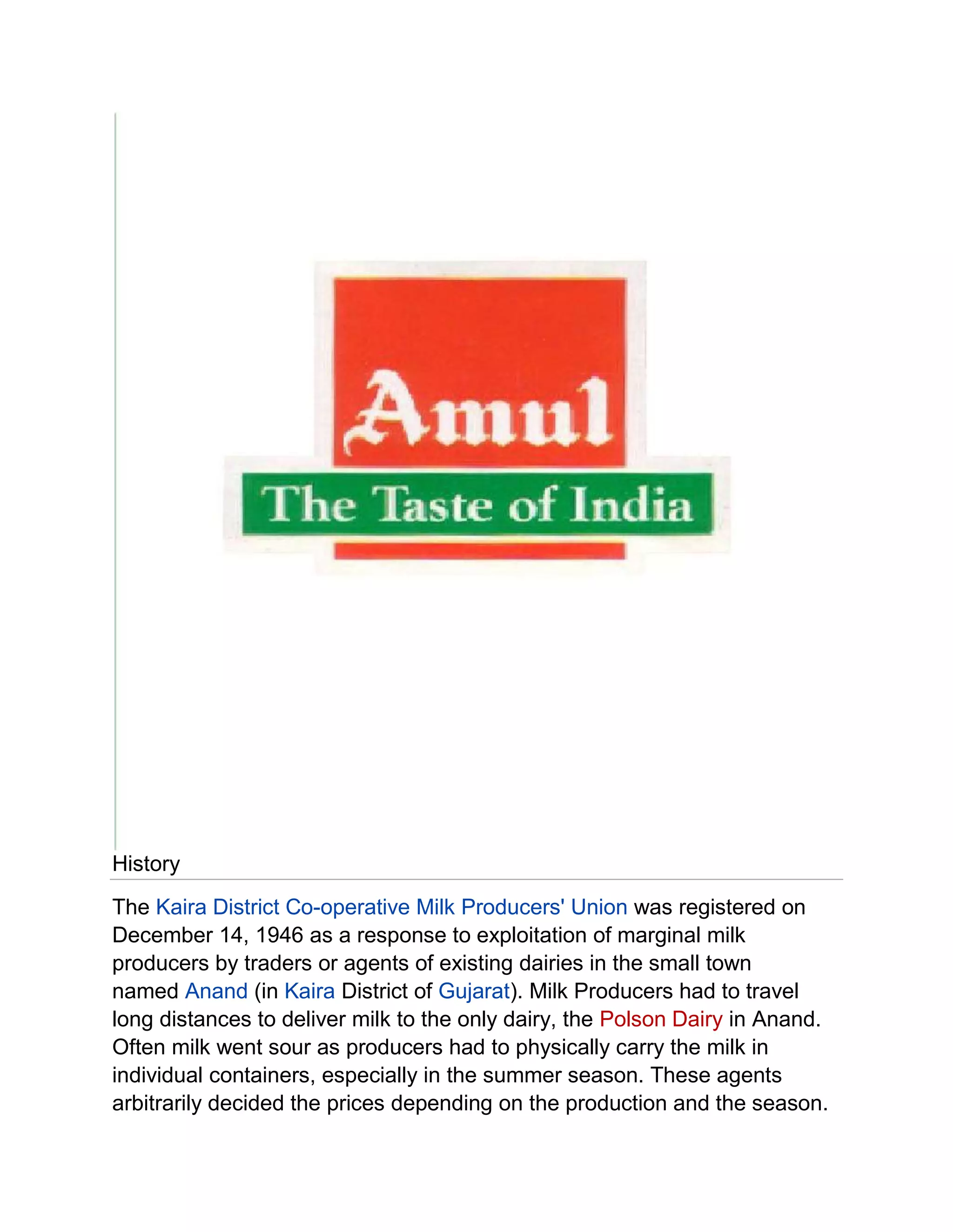 The Kaira District Co-operative Milk Producers' Union was established in 1946 in response to exploitation of milk producers in the Anand region of Gujarat, India. Marginal farmers struggled to transport milk long distances to sell individually to traders who set arbitrary low prices. With the help of Sardar Vallabhbhai Patel and Morarji Desai, farmers formed a cooperative to collectively process and market their milk. This cooperative became the Amul brand and established the successful "Amul Model" of dairy cooperatives, creating economic and social benefits for farmers.