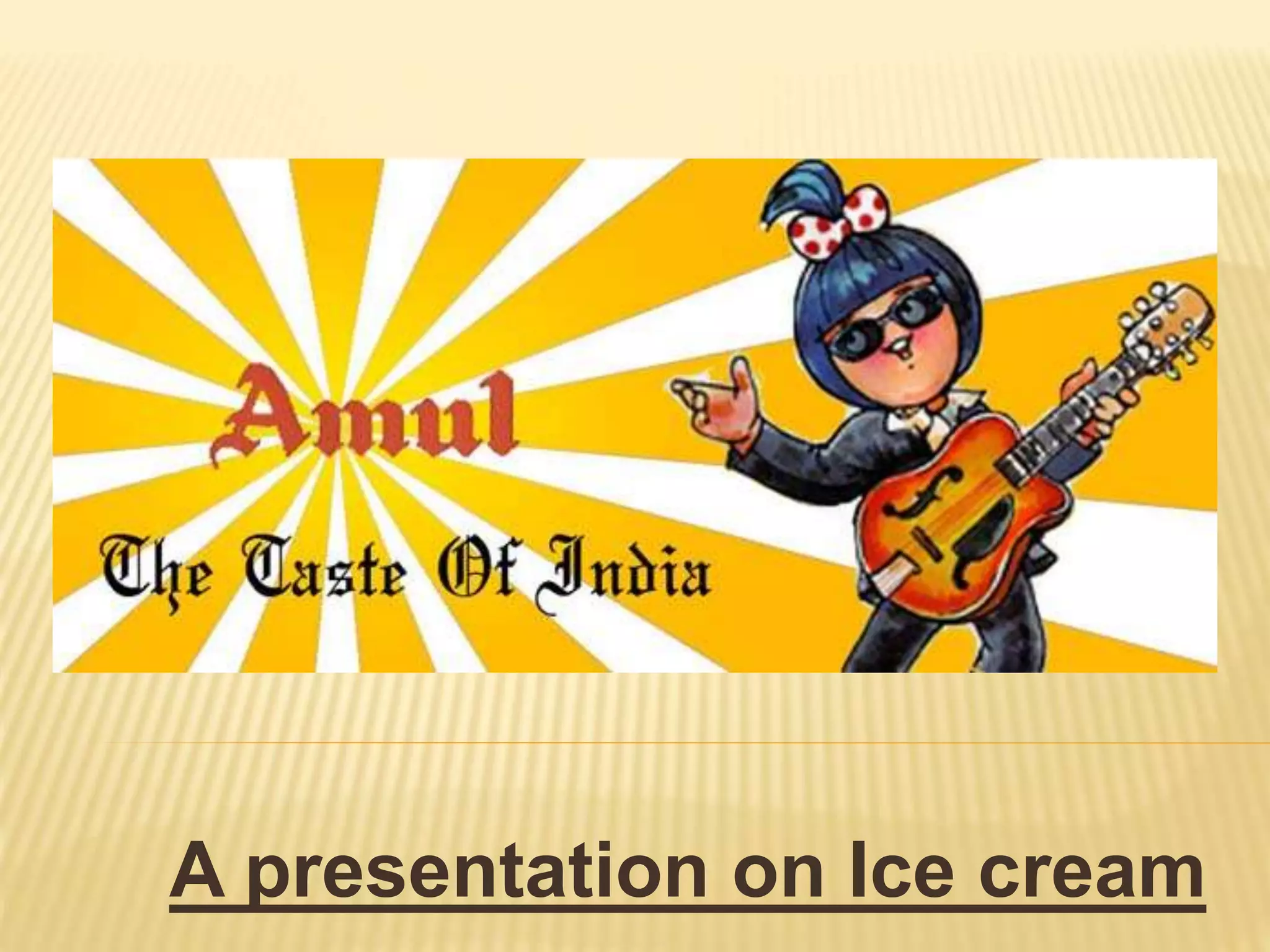 Amul is a dairy cooperative in India owned by millions of milk producers. It produces dairy products including ice cream and markets them nationally and internationally. Amul follows a unique cooperative business model where it collects milk directly from farmers and converts it into branded products. It has a large market share in India and spends only 1% of revenue on promotions, relying on the iconic Amul girl advertisements. Amul aims to expand further in India and internationally by targeting Indian communities abroad and introducing new products.