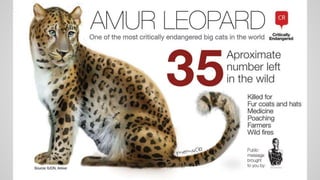 The Amur Leopard is a critically endangered subspecies native to Russia and China, with fewer than 100 individuals remaining in the wild. They are solitary and prey primarily on deer and boars. Major threats include habitat loss due to logging and poaching for their beautiful fur. In 2012, Russia established Land of the Leopard National Park, providing over 600,000 acres of protected habitat critical for the species' survival.