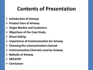This presentation provides an overview of Amway, including its product lines, target markets, objectives, use of direct selling, and importance of communication. It describes Amway's various communication channels like corporate events, publications, and its website. It also discusses Amway's Artistry brand of cosmetics and skin care products and how distributors can become Artistry consultants.