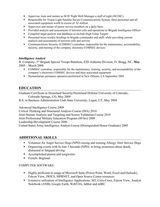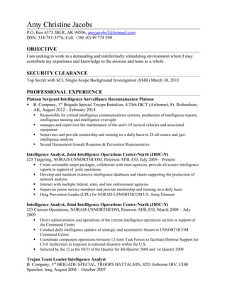 Amy Christine Jacobs is an intelligence analyst seeking a demanding position where she can contribute her experience and knowledge. She has a Top Secret security clearance and over 12 years of experience in intelligence analysis, targeting, and supervision of analysts and junior service members. Her experience includes positions with the Joint Intelligence Operations Center-North, an intelligence platoon in Alaska, and deployments to Iraq.
