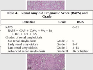 Dr. Sadaf Khan discusses amyloidosis, a disorder caused by the deposition of abnormal protein fibrils in tissues and organs. Amyloidosis can be localized to a single organ or systemic. The type of amyloid protein deposited determines the classification, with the most common types being AL amyloidosis associated with plasma cell dyscrasias and AA amyloidosis associated with inflammatory conditions. Diagnosis involves staining biopsy samples with dyes like Congo red and examining under polarized light. Treatment depends on the type and organ involvement but may include targeting the underlying condition, chemotherapy, dialysis, or organ transplantation.