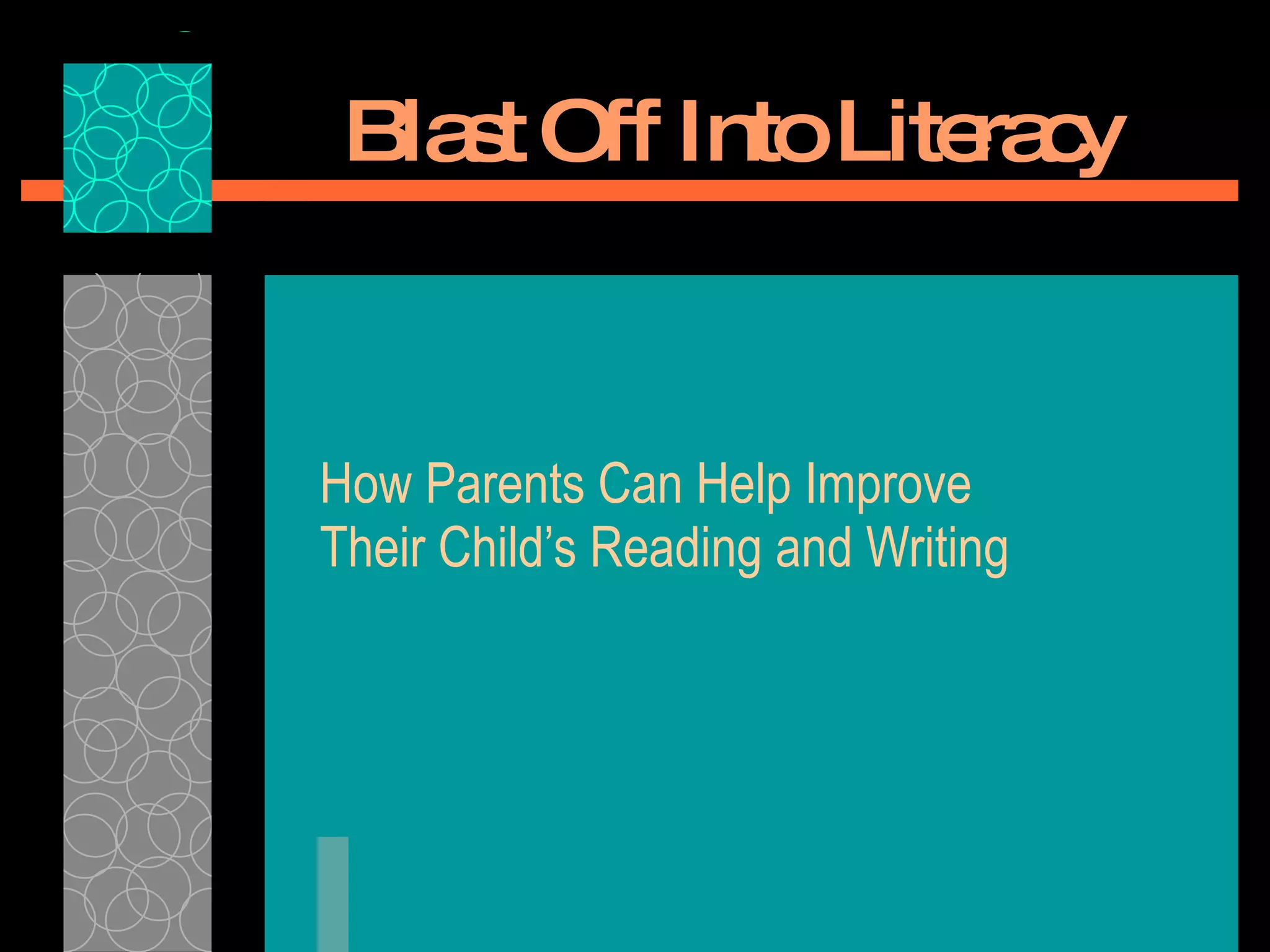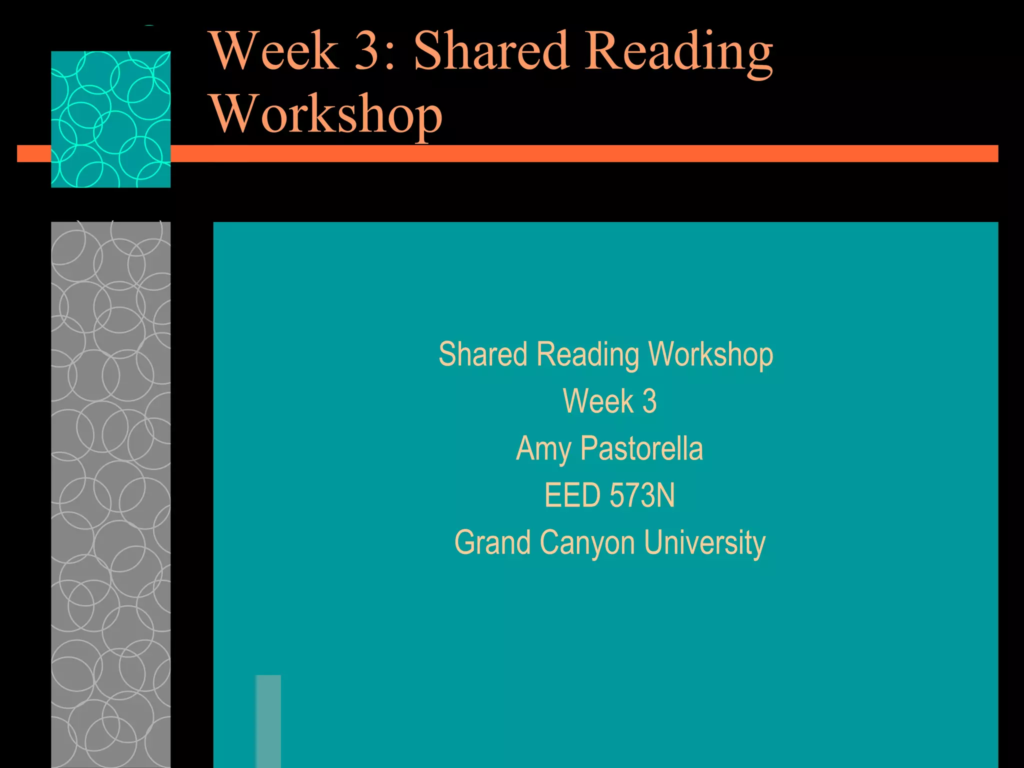 The document outlines a week 3 shared reading workshop focused on strategies for parents to improve their child's reading and writing skills through enjoyable activities. It presents various literacy activities such as word bingo, chutes and ladders, and echo reading that engage students in a low-pressure environment. Emphasizing the importance of parent involvement, it highlights how strong parent-child and teacher-parent relationships contribute to a child's educational success.