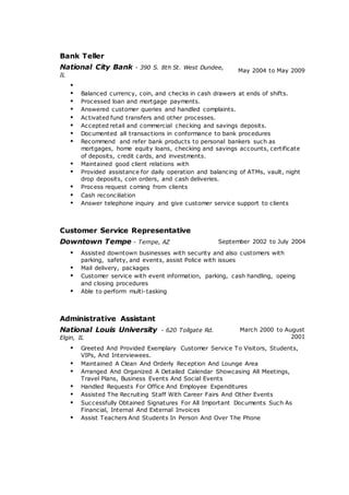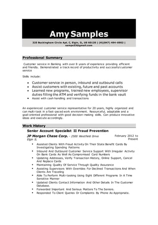 Amy Samples has over 20 years of experience in customer service roles, including her current role as a Senior Account Specialist at JP Morgan Chase, where she assists clients with fraud investigations and provides customer support. She has a background in banking, having previously worked as a Bank Teller at National City Bank. Amy aims to obtain a Bachelor's degree in Art Education from Arizona State University. She is skilled in areas such as communication, multi-tasking, problem-solving and adapting to changing work environments.