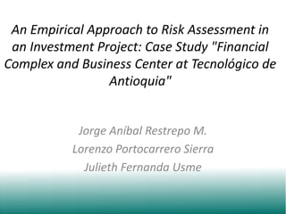 This document presents a risk assessment of an investment project to build a financial complex and business center at Tecnológico de Antioquia University. A Monte Carlo simulation was used to model the net present value and internal rate of return based on the variability of estimated cash flows. The simulation found a 44% chance that the NPV is between $0-51,680 and a 51% chance it is below $0, with an IRR between 7.47%-12.22%. While the financial assessment is positive, the project's main benefit is providing students, teachers and entrepreneurs experience with financial transactions, negotiations and simulations.