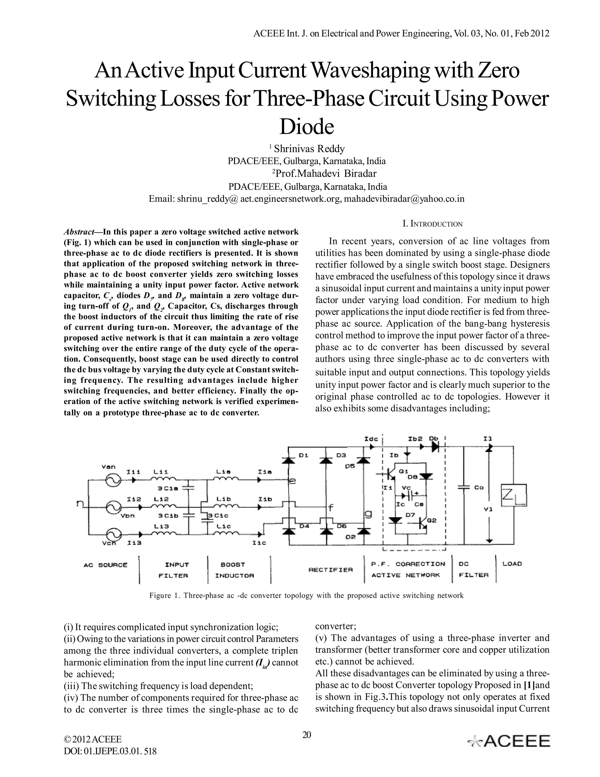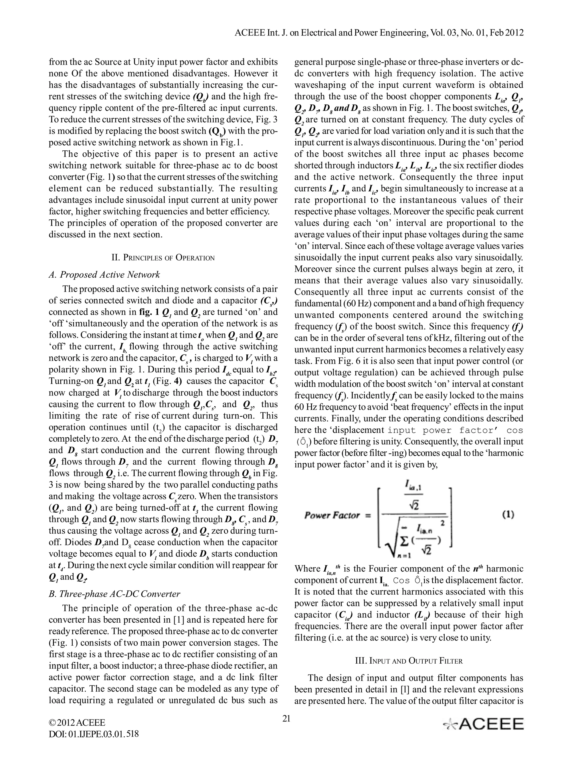 (1) The document presents an active switching network for a three-phase AC to DC boost converter that achieves zero switching losses while maintaining unity input power factor.