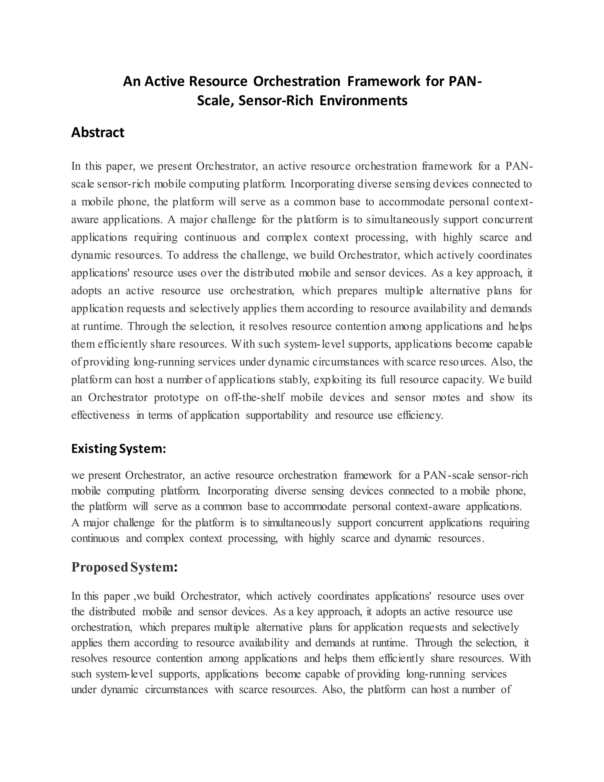 This document presents Orchestrator, an active resource orchestration framework designed for a pan-scale, sensor-rich mobile computing platform, enabling support for context-aware applications despite scarce resources. It addresses the challenges of simultaneous application operations and resource contention by coordinating resource use actively and preparing alternative plans based on real-time availability. A prototype demonstrates its efficiency and effectiveness in sustaining application support and optimizing resource utilization.