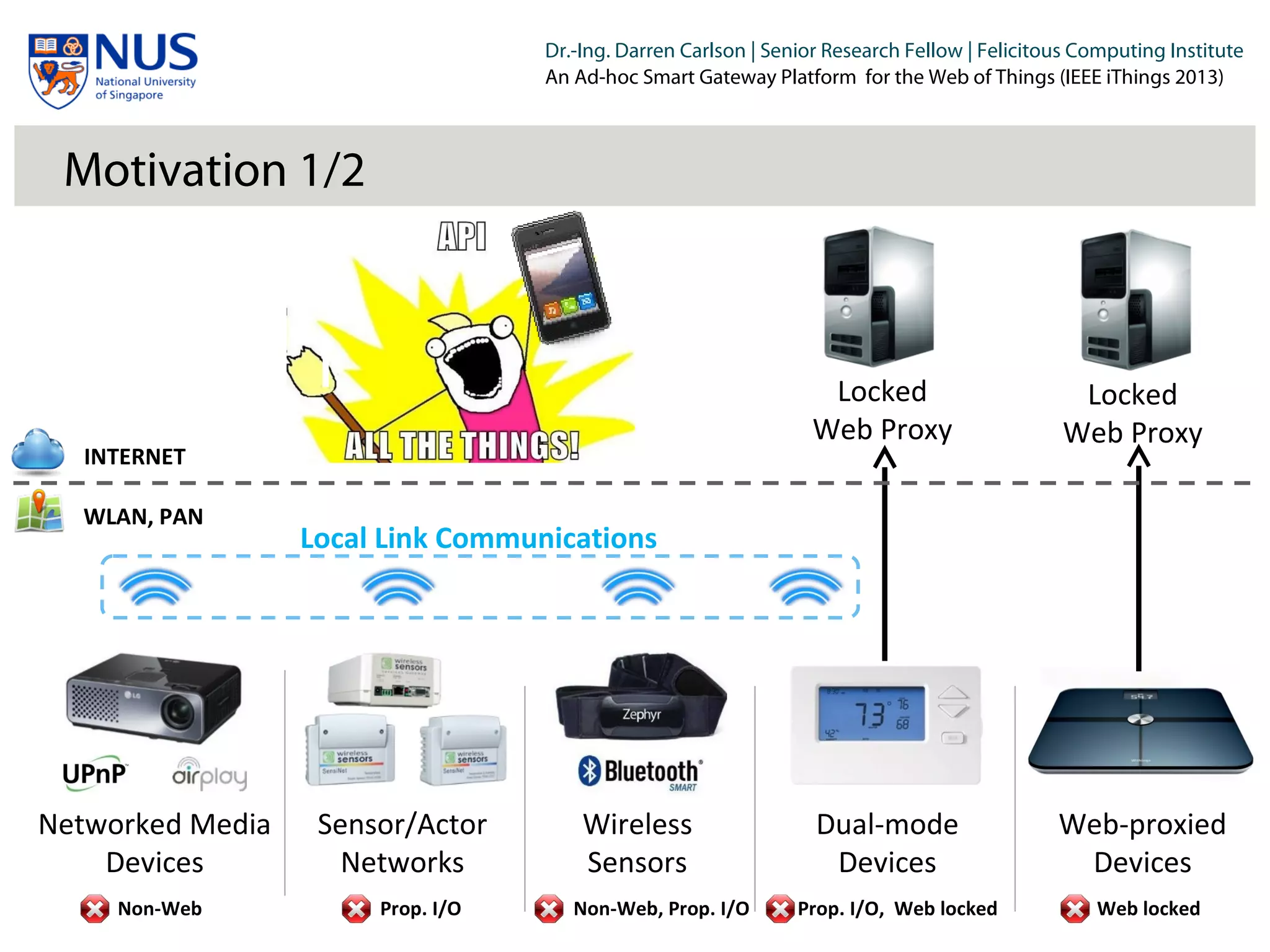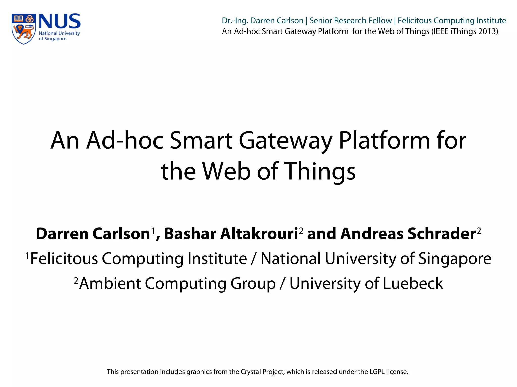 The document presents an ad-hoc smart gateway platform for the Web of Things, highlighting its potential in local communications, context-awareness challenges, and the dynamic provisioning of context plug-ins through the 'Dynamix' framework. It outlines the implementation of various plug-ins that enhance browser-based applications and facilitate interaction with devices, such as media playback and sensor integration. The presentation concludes with an invitation for community involvement in plug-in and app development.